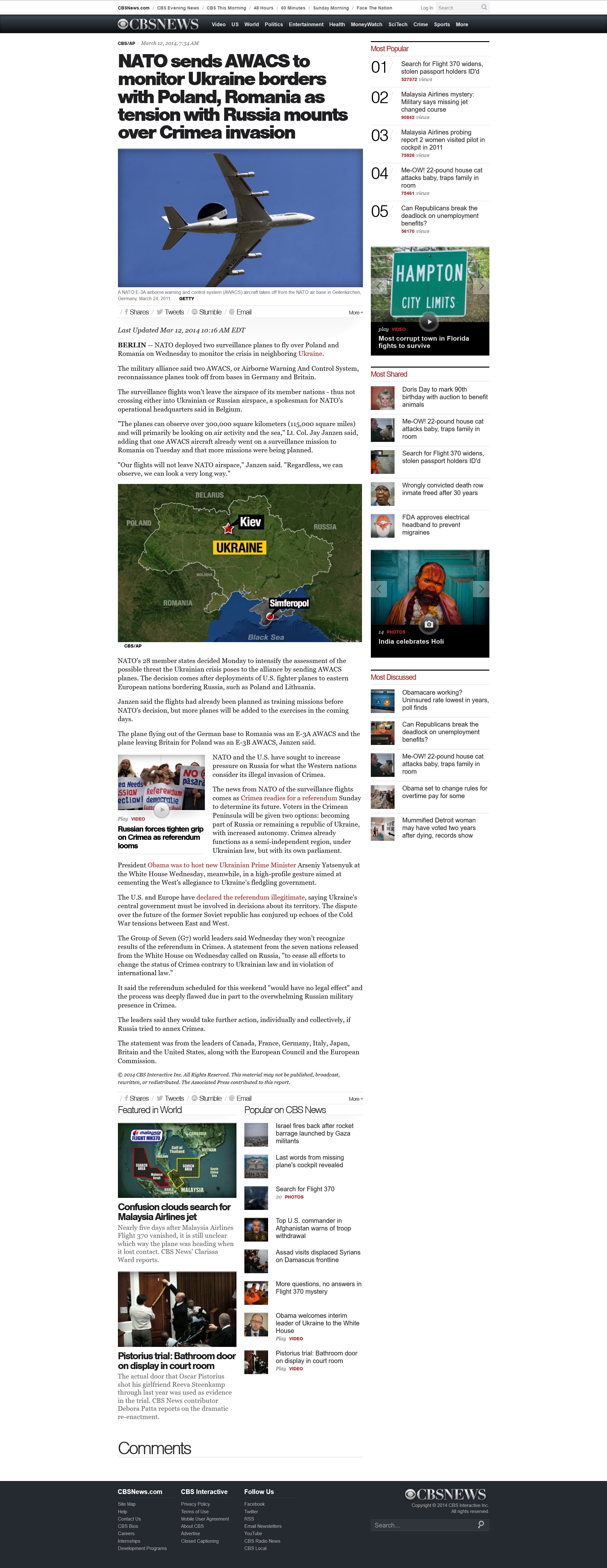 At least since March 2014 NATO sent AWACS to patrol the borders of Ukraine. NATO said it used them tolook a very long way** and that the surveillance flights wouldenhance the alliance's situational awareness**. These Awacs were used to spy on the war zone and beyond. Spiegel reported:Two NATO AWACS were patrolling the border of Ukraine and spotted flight MH17 by radar, then they lost contact and MH17 was shot down around 30 minutes later.**