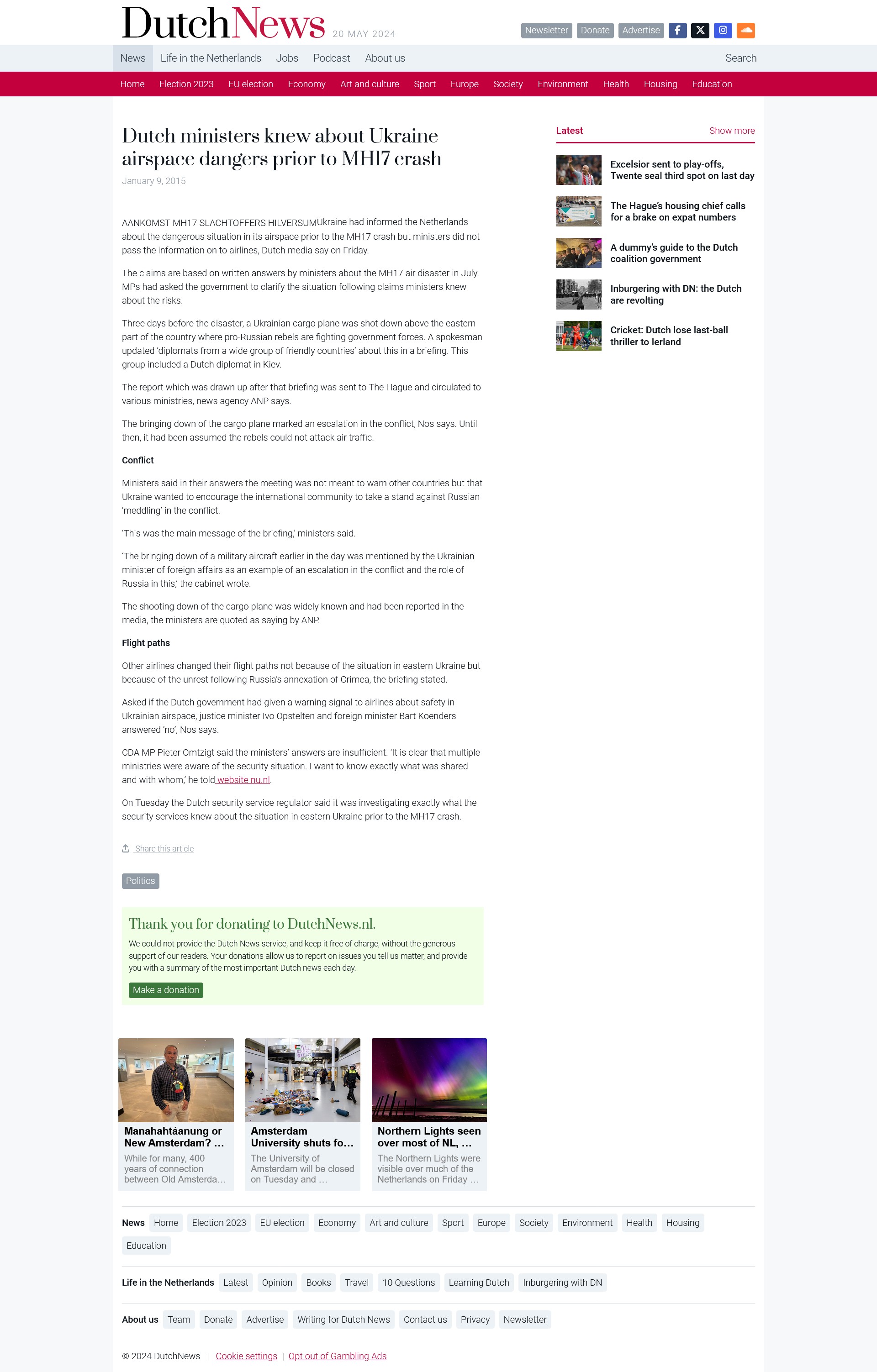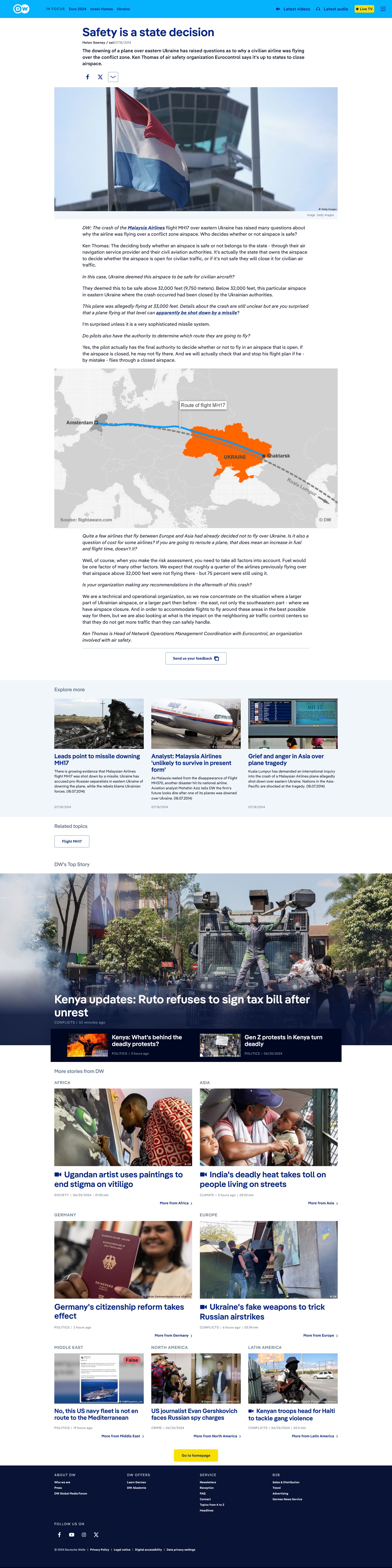 According to Eurocontrol the responsibility for letting passenger flights fly over certain territory is with the state.* The responsibility for allowing passenger flights over this intensifying war zone was primarily with NATO with its overseeing military intelligence capabilities, the newly installed Ukrainian pro-American puppet government led by president Petro Poroshenko, and the Dutch government which neglected warnings from the Ukrainian authorities as later became known. Ukraine had informed the Netherlands about the dangerous situation in its airspace prior to the MH17 crash but ministers did not pass the information on to airlines.*