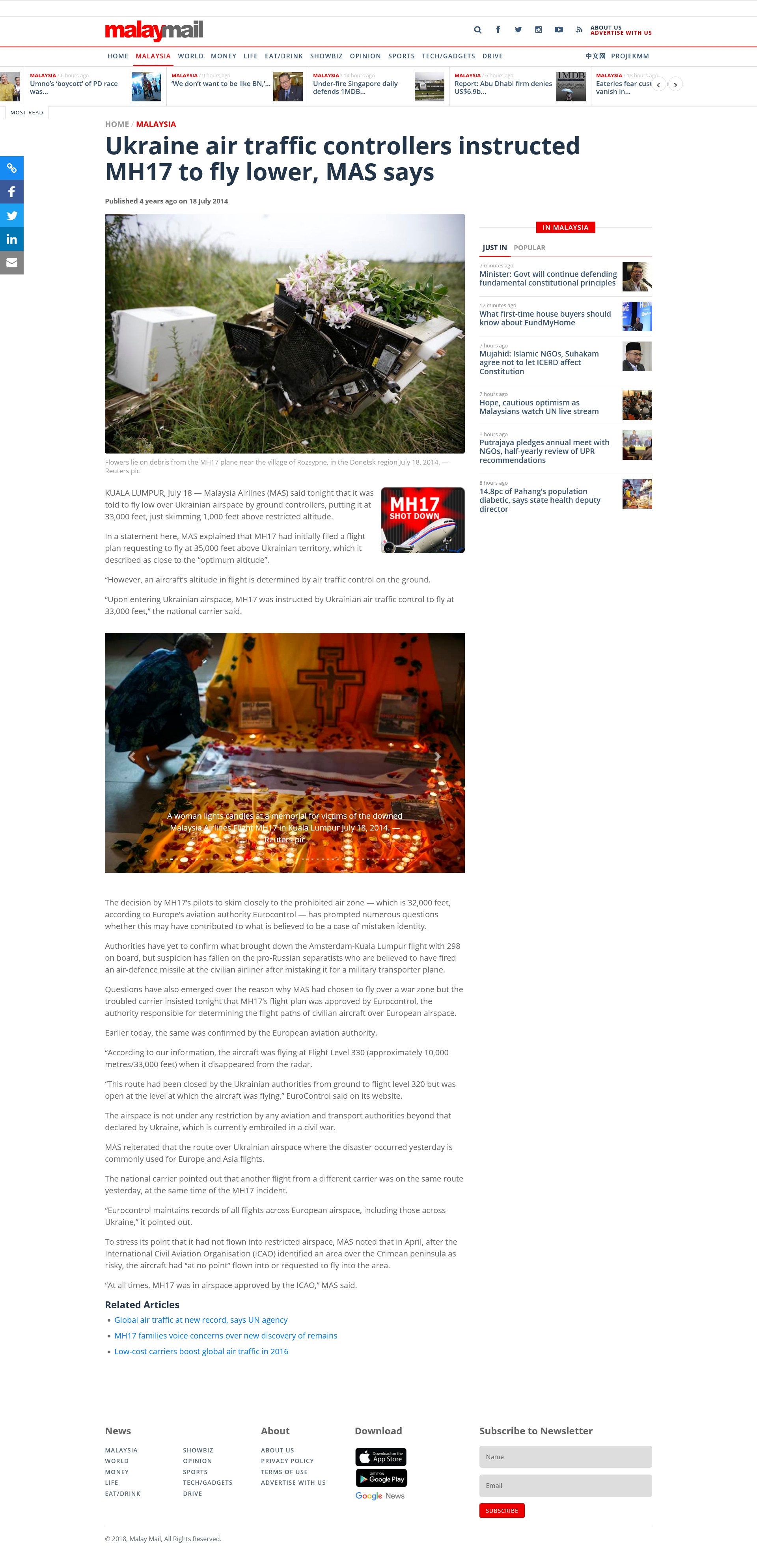 Malay Mail reported that Malaysia Airlineswas told to fly low over Ukrainian airspace by ground controllers, putting it at 33,000 feet, just skimming 1,000 feet above restricted altitude.**