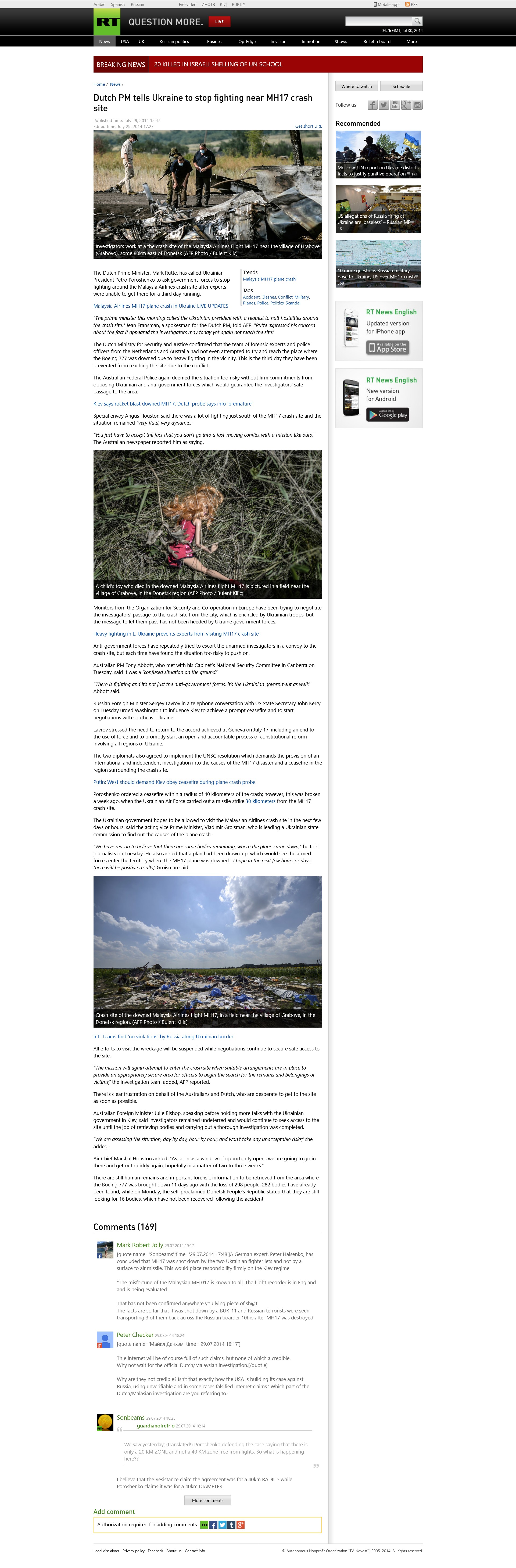 However, the western-backed government in Kiev didn't feel like a truce and soon launched a heavy offensive around the crash zone. On 22 July the Guardian reported:investigators say train being loaded with bodies will soon be moved as Ukraine launches offensive near Donetsk station.** On 27 July the Daily Mail reported:fighting was taking place too close to the MH17 crash site*. On 27 July Andriy Lysenko, a spokesman for Ukraine's Security Council, gave the following statement:All our troops are aiming to get there and liberate this territory so that we can guarantee that international experts can carry out a 100-percent investigation of the site and get all proof needed to deduce the real reason for this tragedy.** On 28 July 2014 the National Post reported:Government troops have stepped up their push to win back territory from pro-Russian separatists in fighting that the United Nations said Monday has killed more than 1,100 people in four months. The international delegation of Australian and Dutch police and forensic experts stopped Monday in Shakhtarsk, a town around 30 kilometres from the fields where the Boeing 777 was brought down. Sounds of regular shelling could be heard from Shakhtarsk and residents were seen fleeing town in cars.** On 29 JulyDutch Prime Minister Mark Rutte has called Ukrainian President Petro Poroshenko to ask government forces to stop fighting around the Malaysia Airlines crash site after experts were unable to get there for a third day running.**