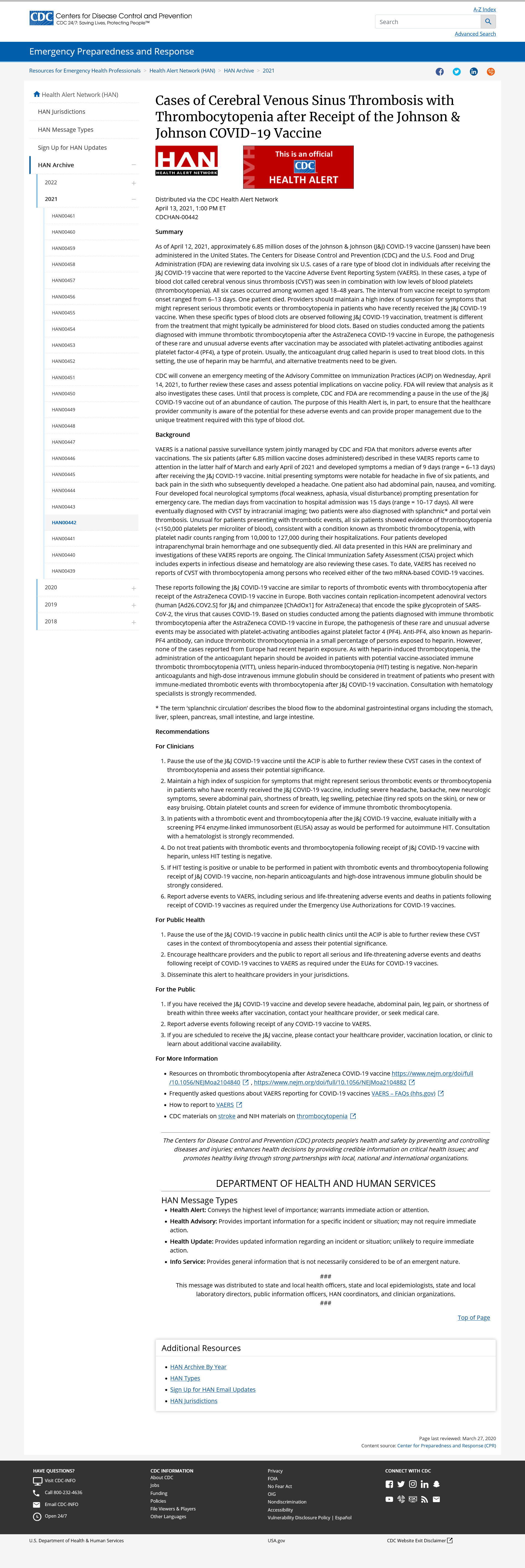 In March 2021, concerns developed regarding an increased risk of thrombosis associated with thrombocytopenia among persons who had received ChAdOx1 nCoV-19. By the end of the month, groups from Norway, Germany, Austria, and the United Kingdom reported on persons admitted to the hospital 5 to 24 days after vaccination with ChAdOx1 nCoV-19. These patients had thrombosis at unusual sites... Most of these patients were previously fit, healthy young persons.