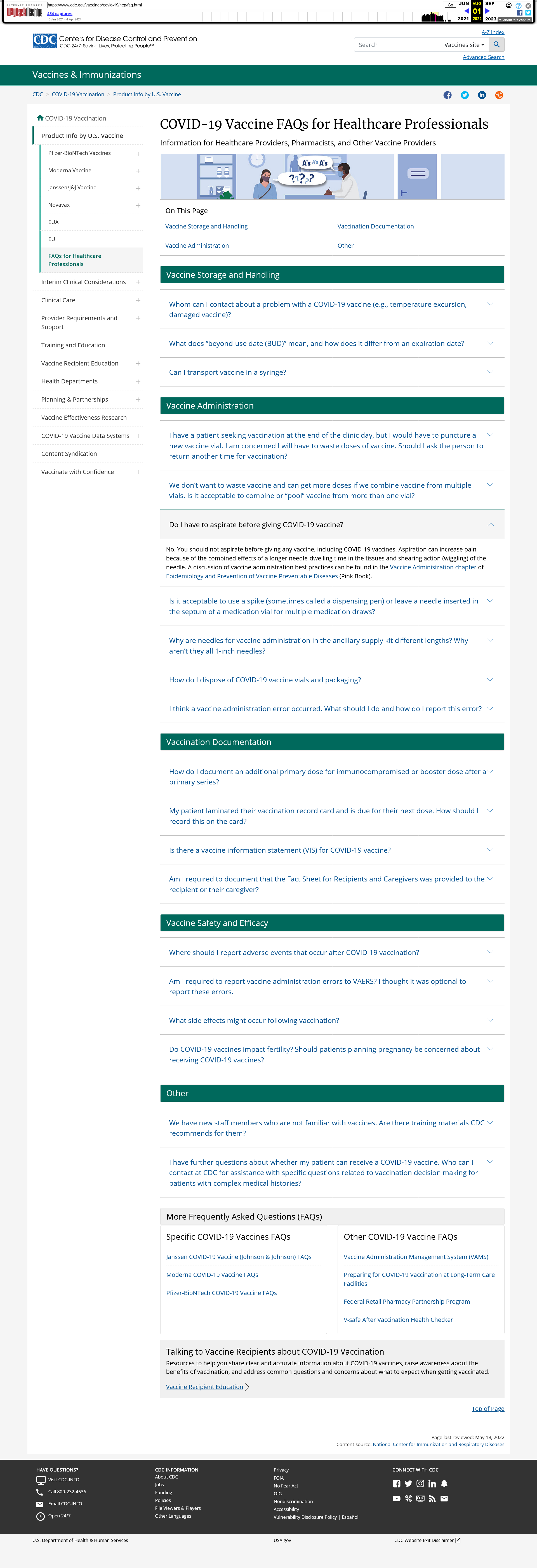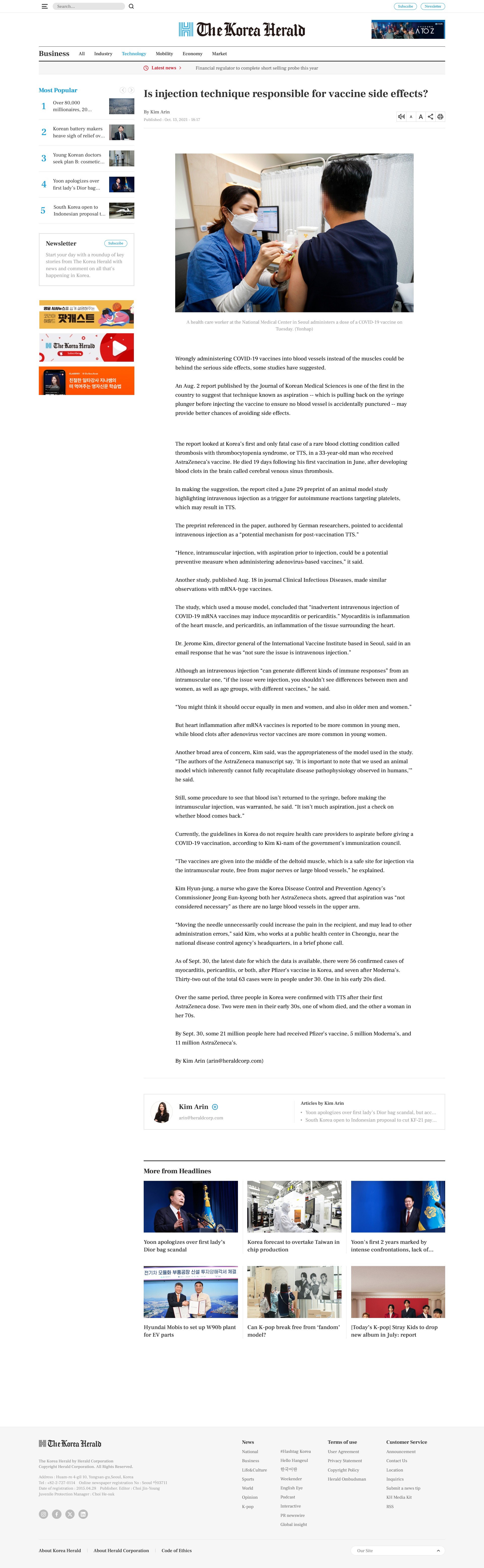 In October 2021 the Korea Herald reported thatwrongly administering COVID-19 vaccines into blood vessels instead of the muscles could be behind the serious side effects.** In April 2022 Germany changed protocols to include aspiration for mRNA vaccination.* So because it's important that the lipid nanoparticles with mRNA stay at the site of injection the nurse can check whether the needle punctured a blood vessel by doing aspiration, drawing back of the syringe to check for blood. If blood is present the nurse can change the injection location. Remarkably, at least until the beginning of August 2022 the CDC advised to not do aspiration...