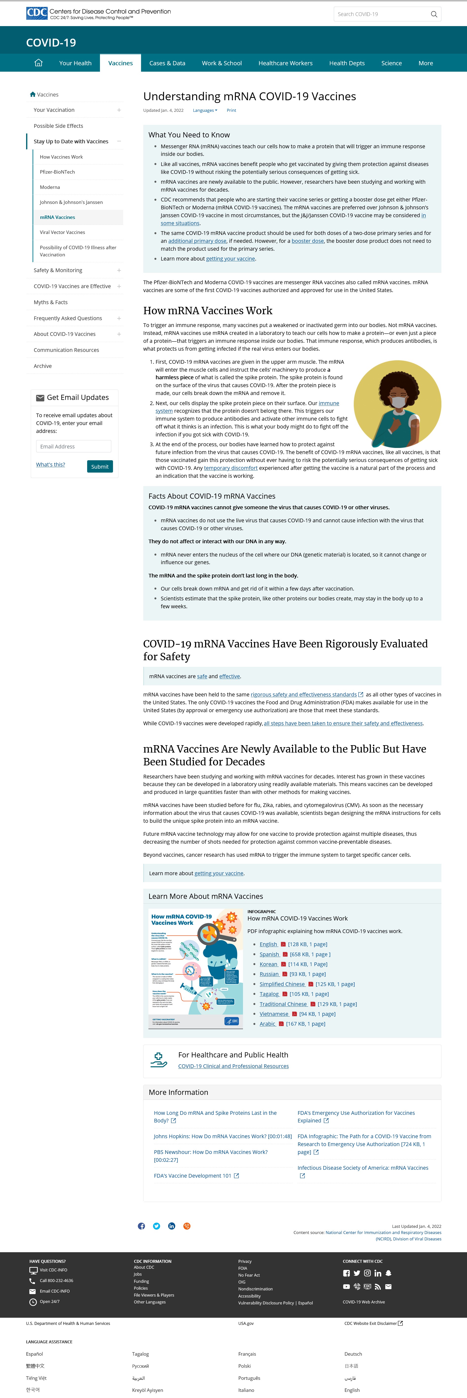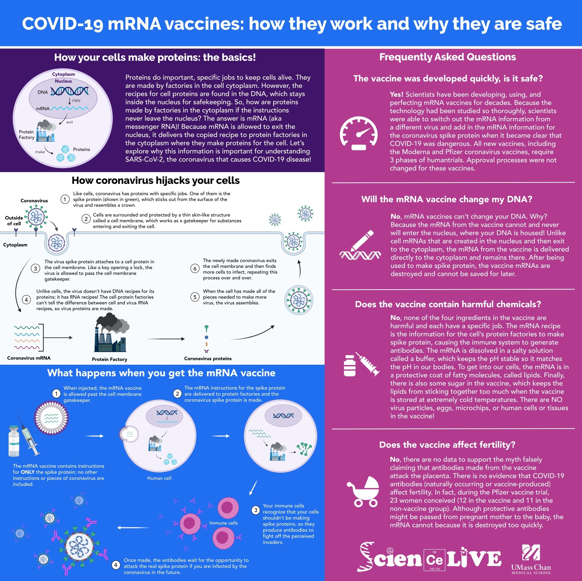 mRNA contained in lipid nanoparticles is injected into the muscle in the shoulder, enters the muscle cells and then instructs those cells to produce a spike protein similar to that of the SARS-CoV-2 virus. That spike protein is used by the virus to enter and infect the host cell. Then the foreign mRNA and spike proteins are removed from the body within days.