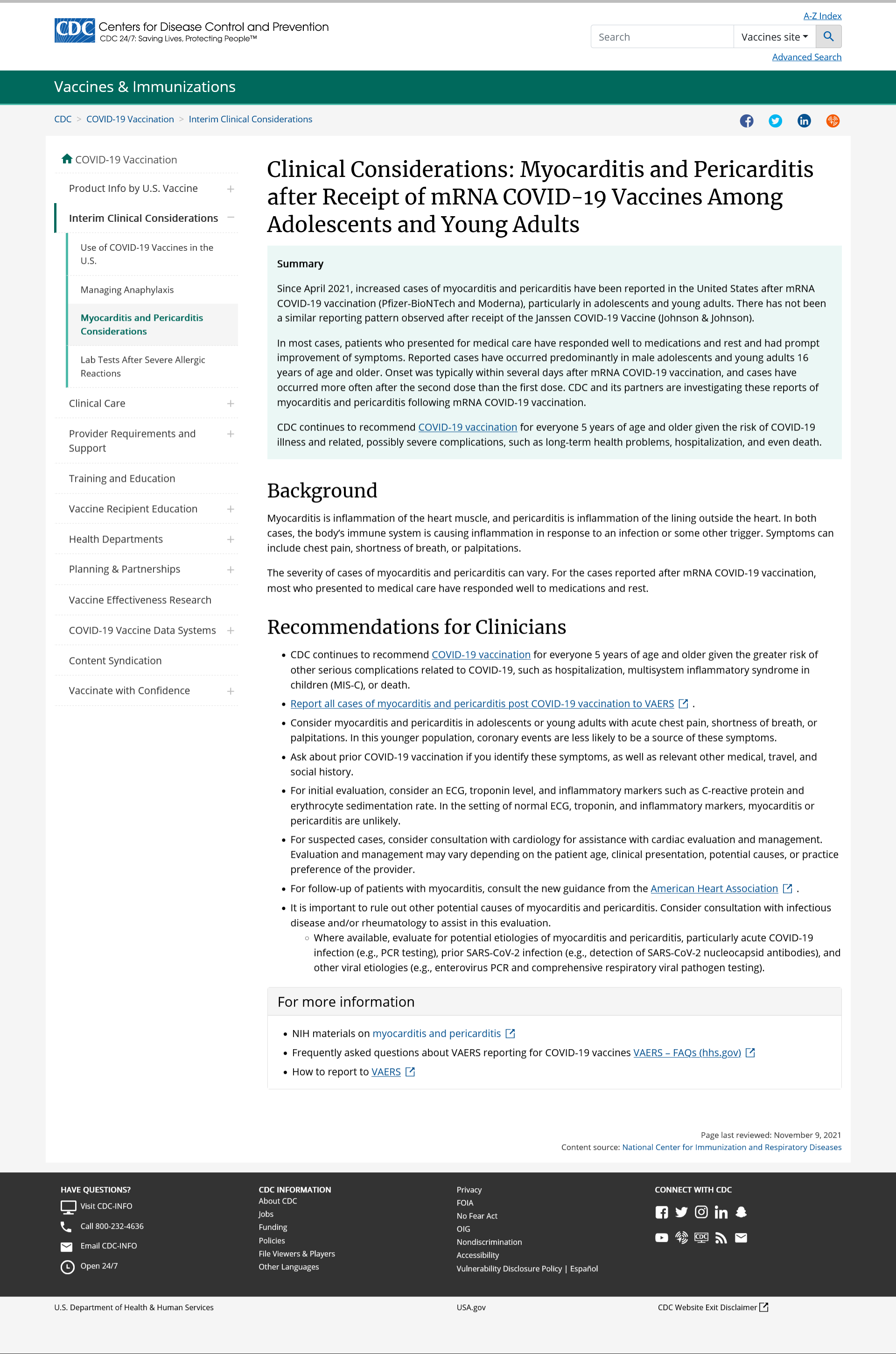 In June 2021 NBC and CDC reported:A higher-than-usual number of cases of a type of heart inflammation has been reported following Covid-19 vaccination, especially among young men following their second dose of an mRNA vaccine.** In November 2021 CDC reported:Since April 2021, increased cases of myocarditis and pericarditis have been reported in the United States after mRNA COVID-19 vaccination.** Then in February 2022 the European Medicines Agency (EMA) reported:Events of Myocarditis and Pericarditis have been reported. ... Post-authorization reports have been reported more frequently in adolescent and young adult male patients following the second dose of vaccine; however, reports have been received for adult males and females of broader age range and following the first vaccination also.** In April 2022:Findings raise concerns regarding vaccine-induced undetected severe cardiovascular side-effects and underscore the already established causal relationship between vaccines and myocarditis.*
