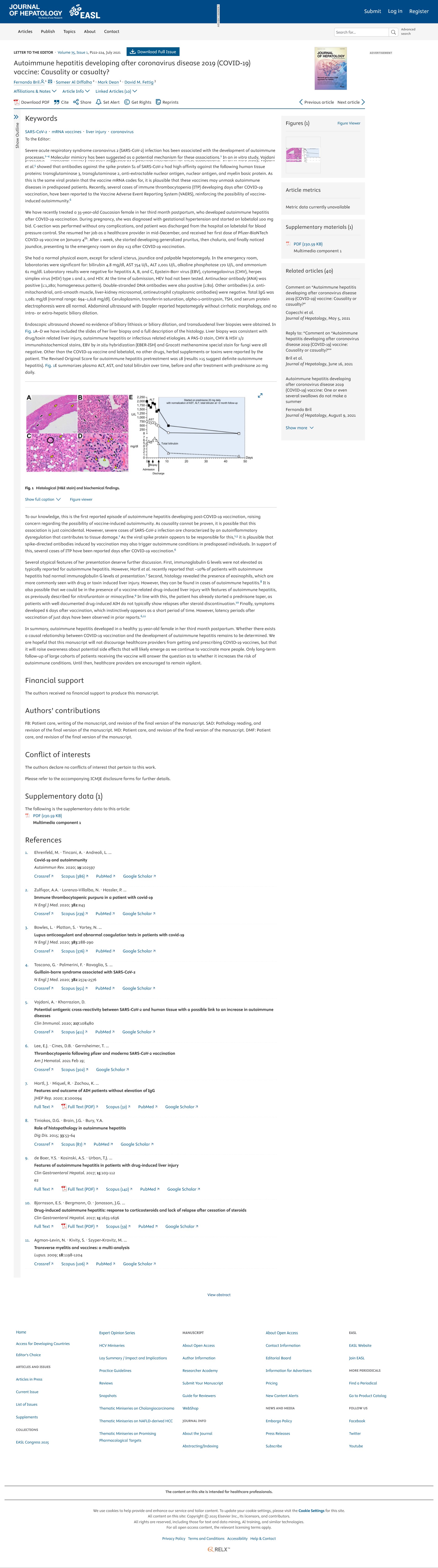 This is the first reported episode of autoimmune hepatitis developing post-COVID-19 vaccination, raising concern regarding the possibility of vaccine-induced autoimmunity. As causality cannot be proven, it is possible that this association is just coincidental. However, severe cases of SARS-CoV-2 infection are characterized by an autoinflammatory dysregulation that contributes to tissue damage. As the viral spike protein appears to be responsible for this, it is plausible that spike-directed antibodies induced by vaccination may also trigger autoimmune conditions in predisposed individuals.*