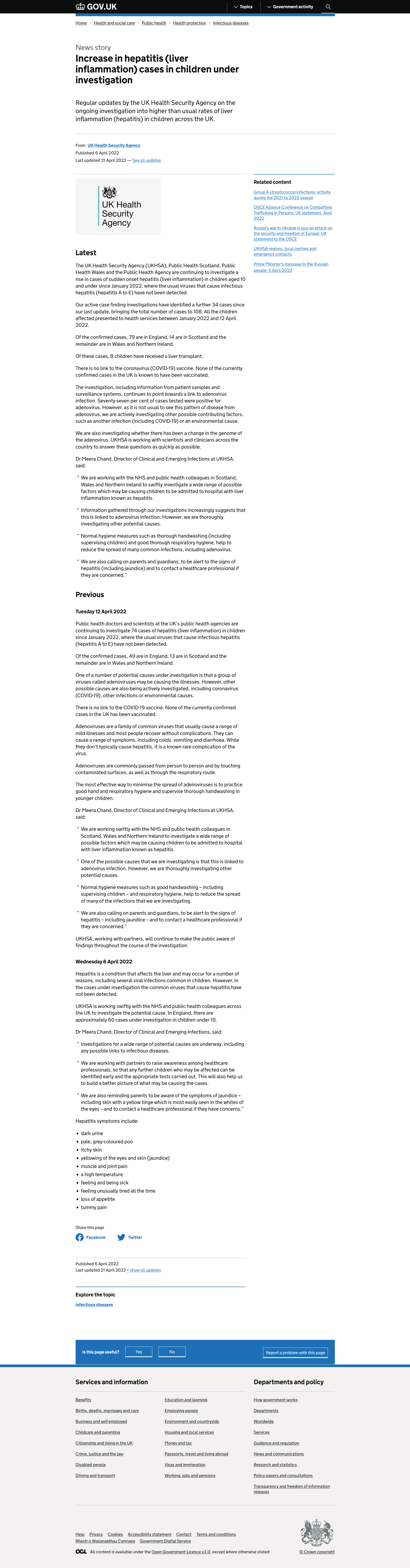 The UK Health Security Agency (UKHSA), Public Health Scotland, Public Health Wales and the Public Health Agency are continuing to investigate a rise in cases of sudden onset hepatitis (liver inflammation) in children aged 10 and under since January 2022, where the usual viruses that cause infectious hepatitis (hepatitis A to E) have not been detected.**