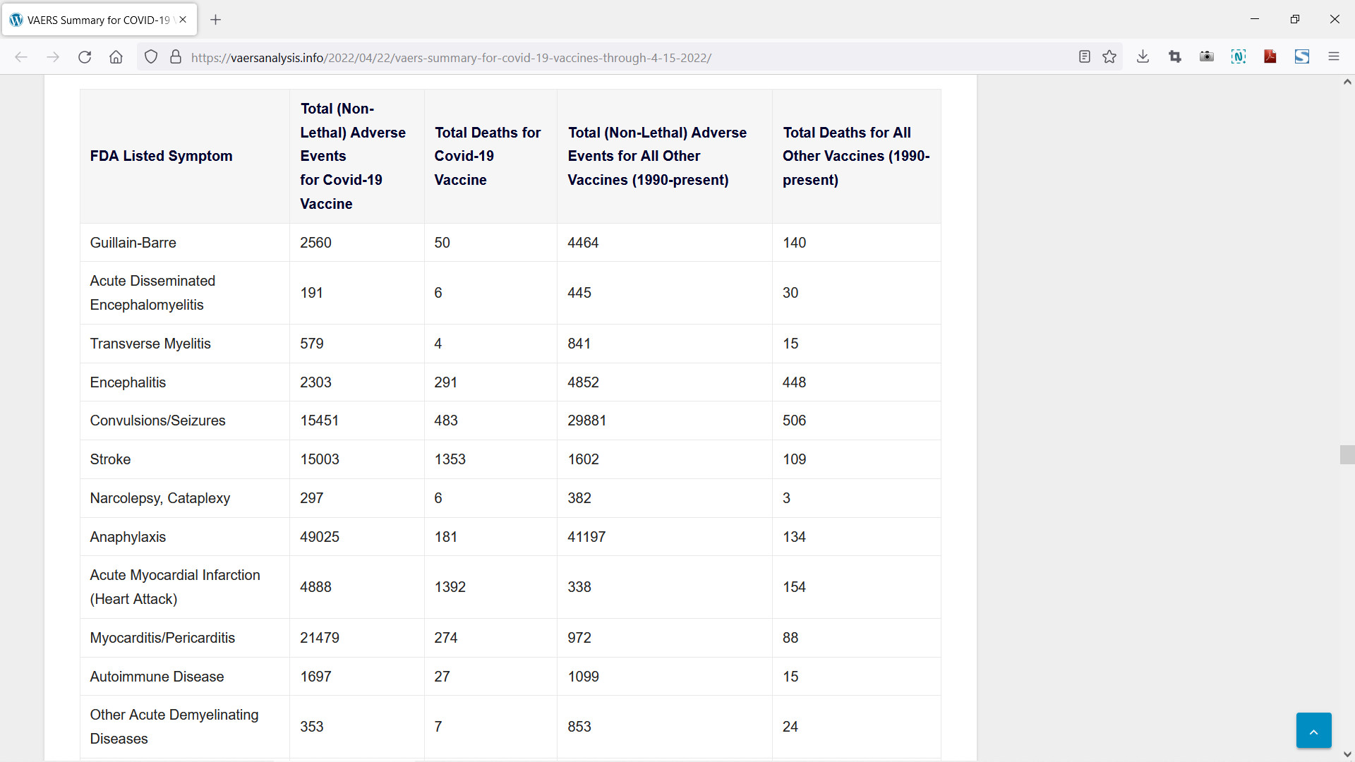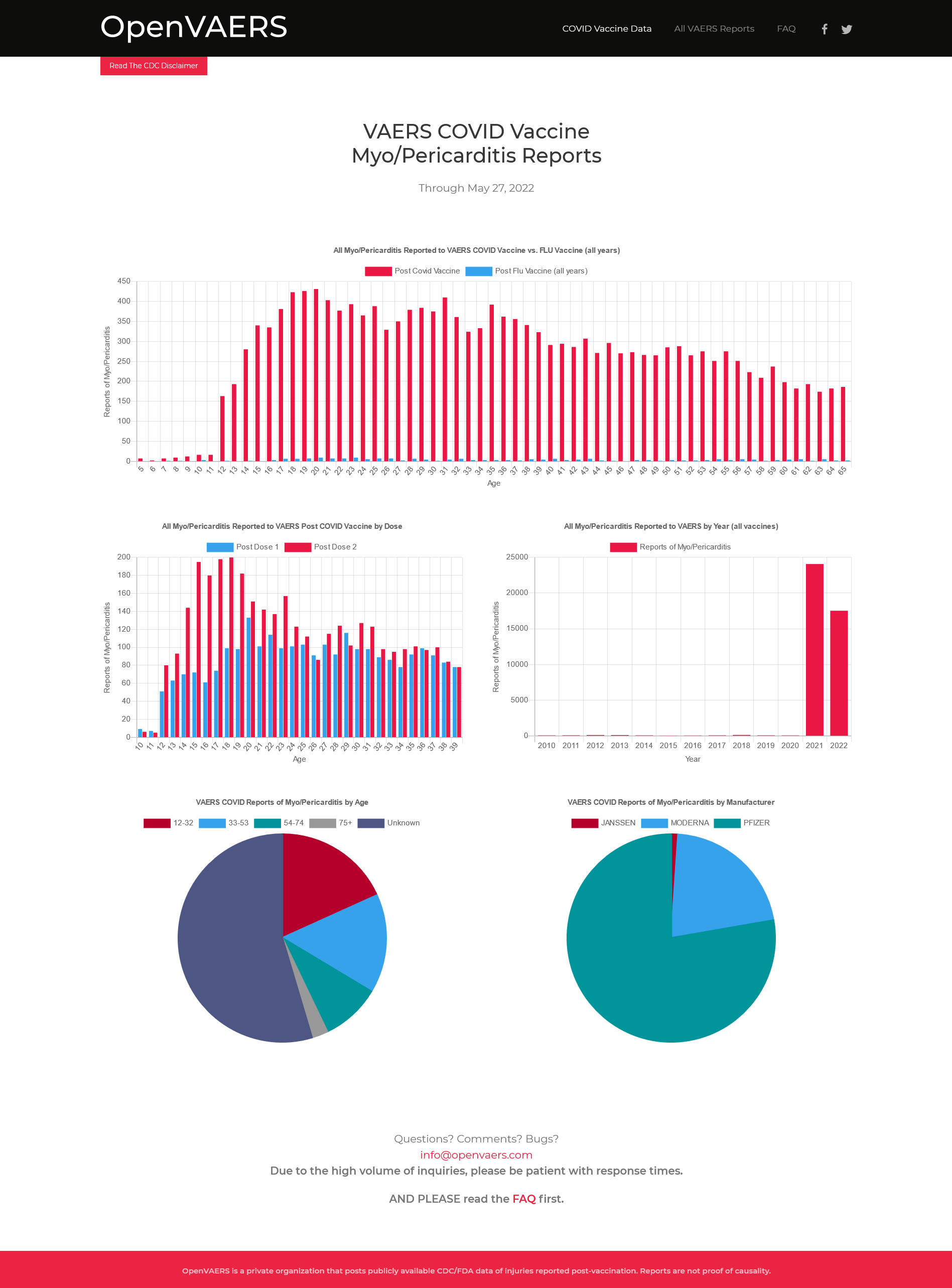 These statistics clearly show what's going on. According to VAERS there were in total 972 reported cases of myocarditis and pericarditis in the US after any vaccination given between 1990 and the present while there were in total 21,479 reported cases after COVID-19 vaccination alone.** And keep in mind that these events are heavily underreported, see VacciNATION. In June 2022:Vaccine-encoded spike protein seems to reach the heart, where it might trigger an inflammatory response, resulting in the development of myocarditis or DCMi.* Other researchers wrote:There's strong evidence of an increased risk of myocarditis and of pericarditis in the week following vaccination against Covid-19 with mRNA vaccines.*