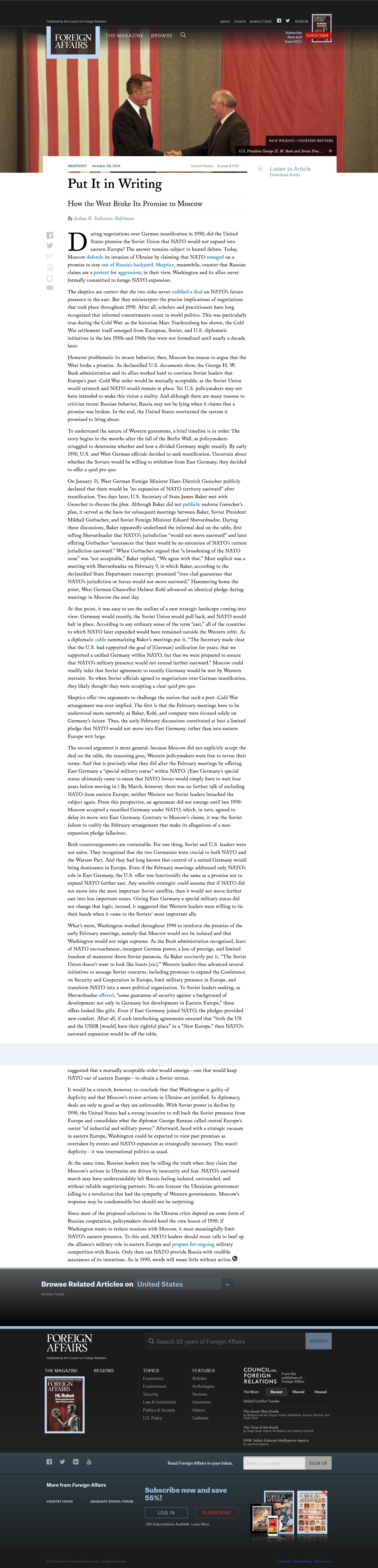 When I was a little boy, my mother taught me that what's good for the goose is good for the gander. And if it's OK for us to have a Monroe Doctrine, if it makes perfect strategic sense for us not to want to have distant great powers on our borders, it should make equally good sense for the Russians to think that way—and, by the way, for the Chinese to think that way. That's the way great powers behave. ... Ukraine is a country that has great geostrategic importance for him [Putin]. And he is going to pay an enormous price to keep NATO and to keep the EU out of that area. He's made that clear since 2008. The Russians have been against NATO expansion from the beginning. They have said that this was going to lead to a strategic disaster.*