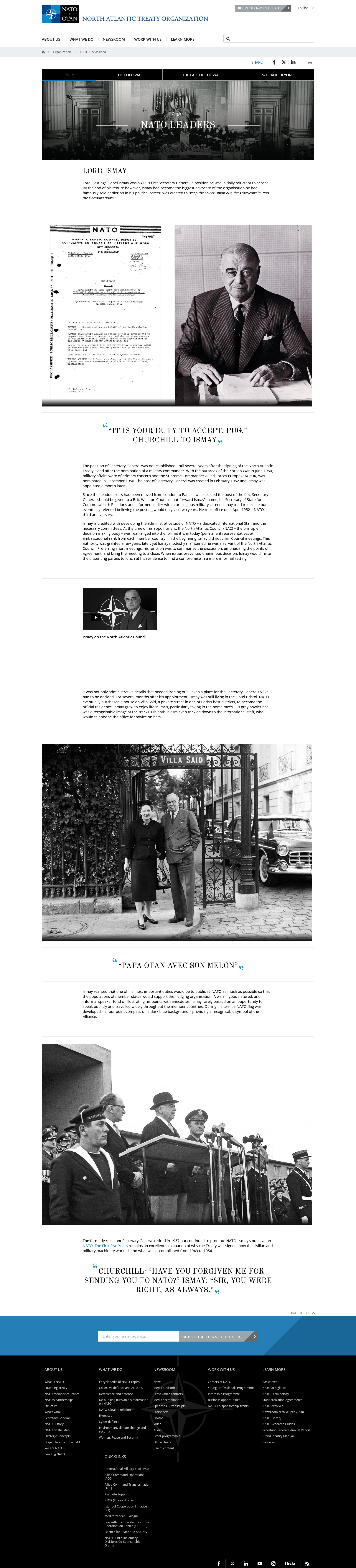 NATO is an alliance of countries from Europe and North America. It provides a unique link between these two continents, enabling them to consult and cooperate in the field of defence and security, and conduct multinational crisis-management operations together. It is the military alliance of the North American and European elite. It is not under the ultimate control of the Secretary General as many think, but under the Supreme Allied Commander Europe who is installed and controlled by the United States elite. That means that NATO is ultimately a US-led military alliance. As General Hastings Lionel Ismay said, NATO was created tokeep the Soviet Union out, the Americans in, and the Germans down.**
