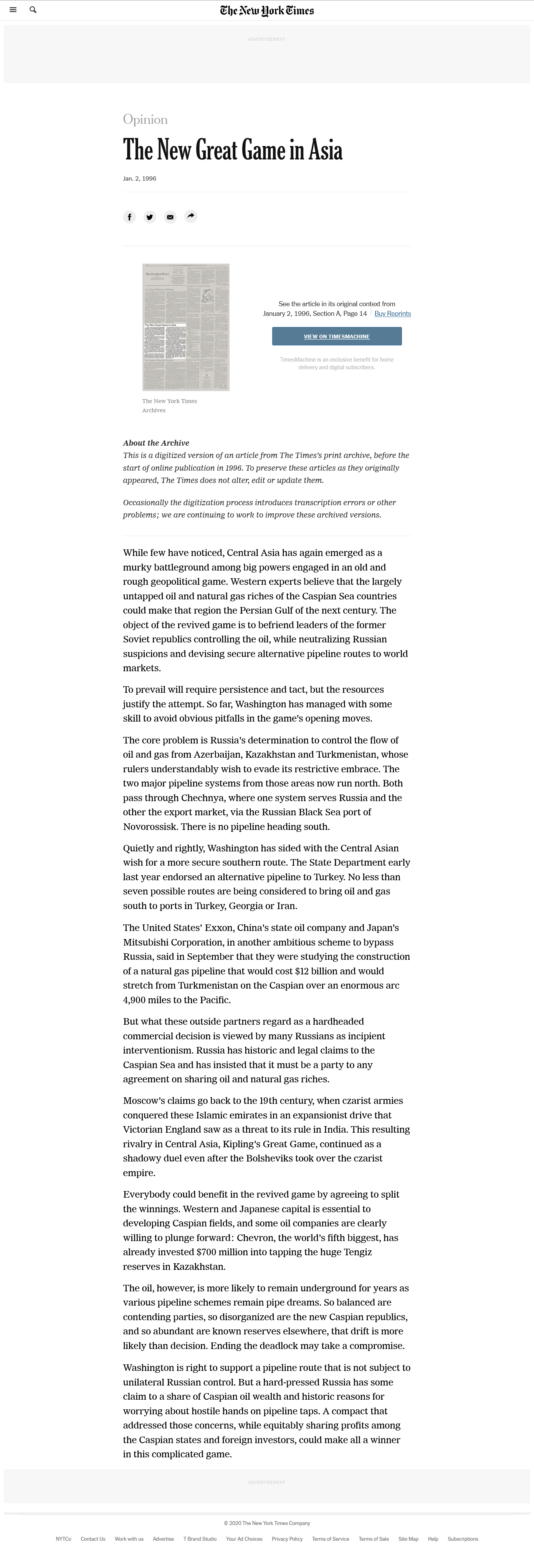 While few have noticed, Central Asia has again emerged as a murky battleground among big powers engaged in an old and rough geopolitical game. Western experts believe that the largely untapped oil and natural gas riches of the Caspian Sea countries could make that region the Persian Gulf of the next century. The object of the revived game is to befriend leaders of the former Soviet republics controlling the oil, while neutralizing Russian suspicions and devising secure alternative pipeline routes to world markets.*