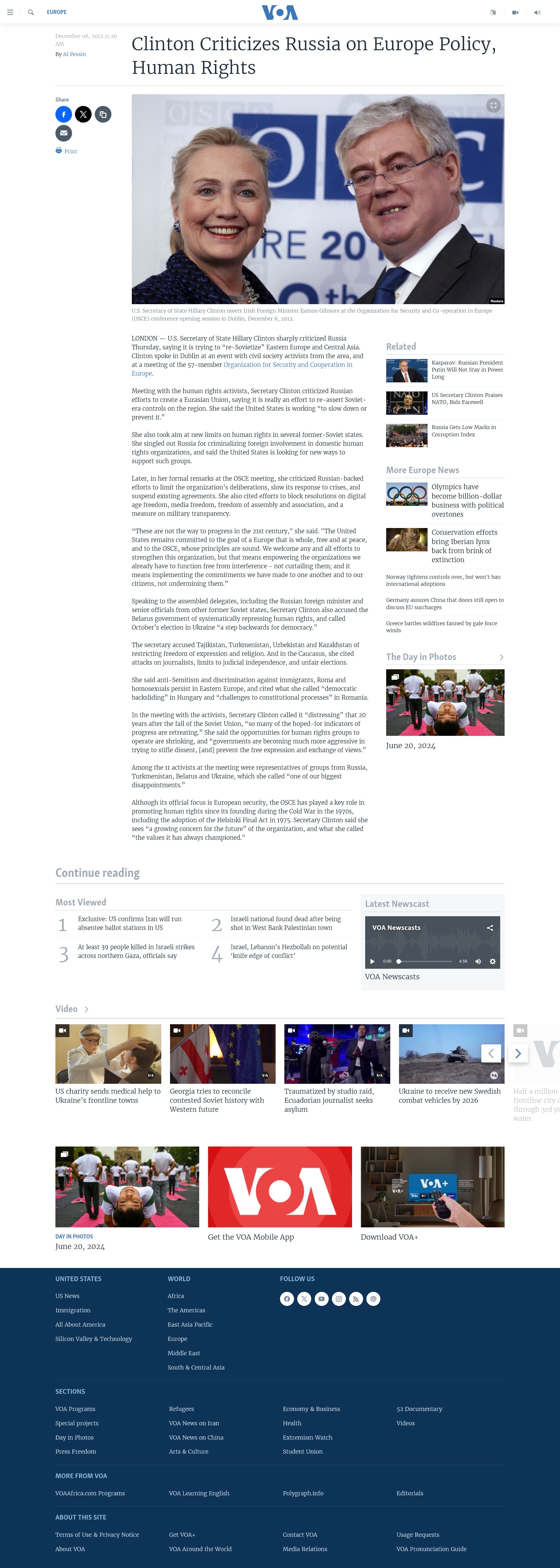 VOA - Clinton Criticizes Russia on Europe Policy, Human Rights