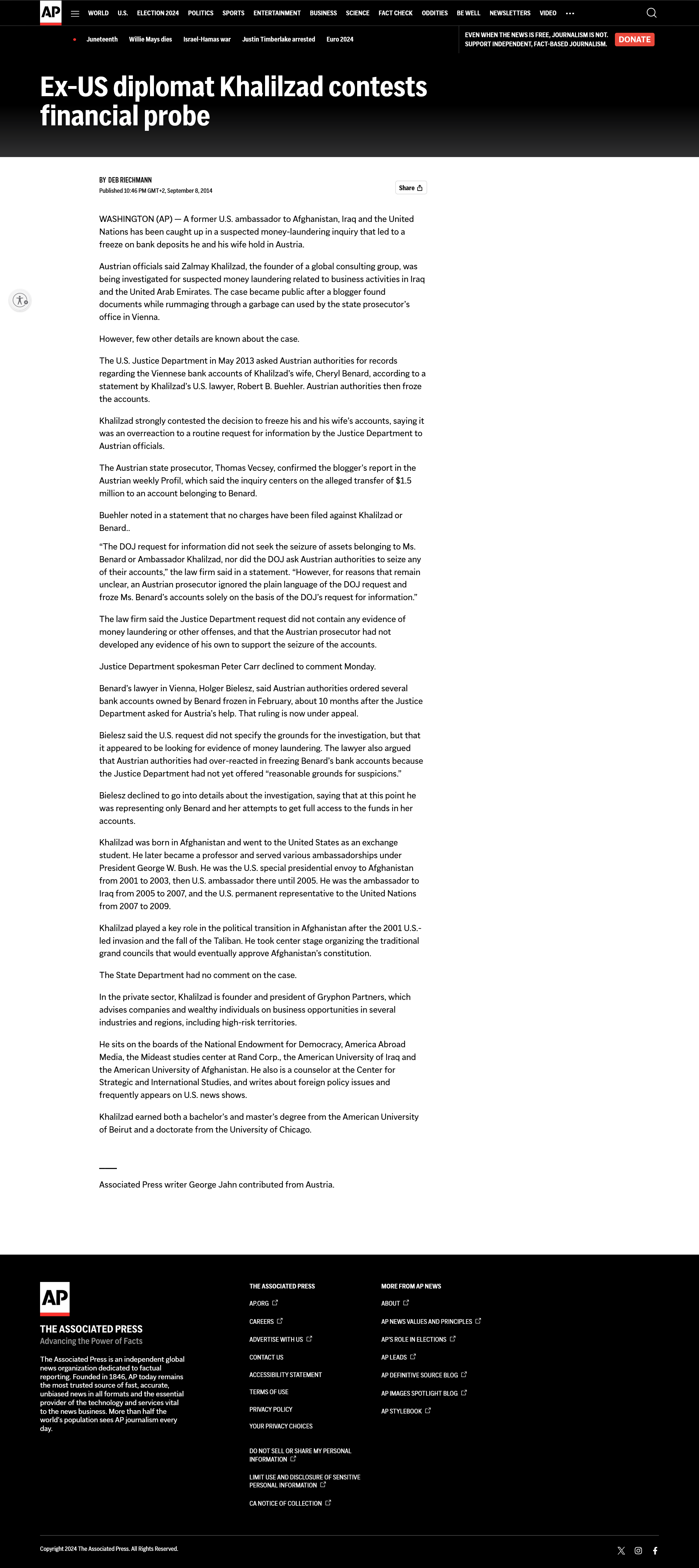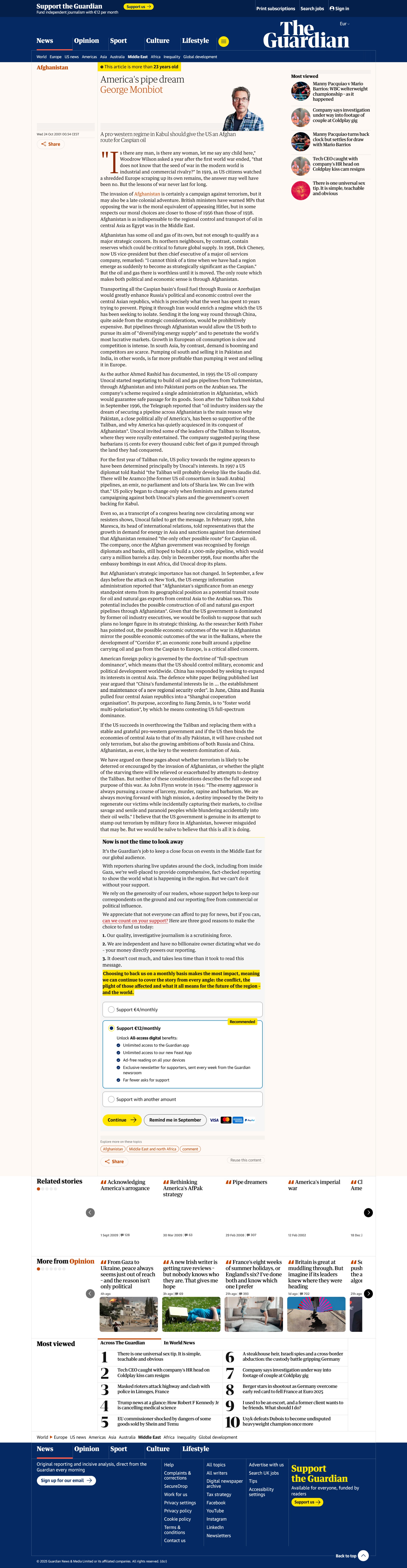 The Taliban was a terrorist organization which violently oppressed Afghan people. Before it became Taliban it was the Mujahideen which was supported by the United States in the fight against the Soviet Union. US interest in Afghanistan had to do with Texas oil company Unocal which was one of the key players in the CentGas consortium, an attempt to build the Trans-Afghanistan Pipeline to run from the Caspian area, through Afghanistan and probably Pakistan, to the Indian Ocean. One of the consultants to Unocal at that time was Zalmay Khalilzad, former US ambassador to Afghanistan, Iraq, and the United Nations. He was a proponent of US global leadership and in 2014 investigated for alleged money-laundering through his wife's bank account in Vienna, Austria.*
