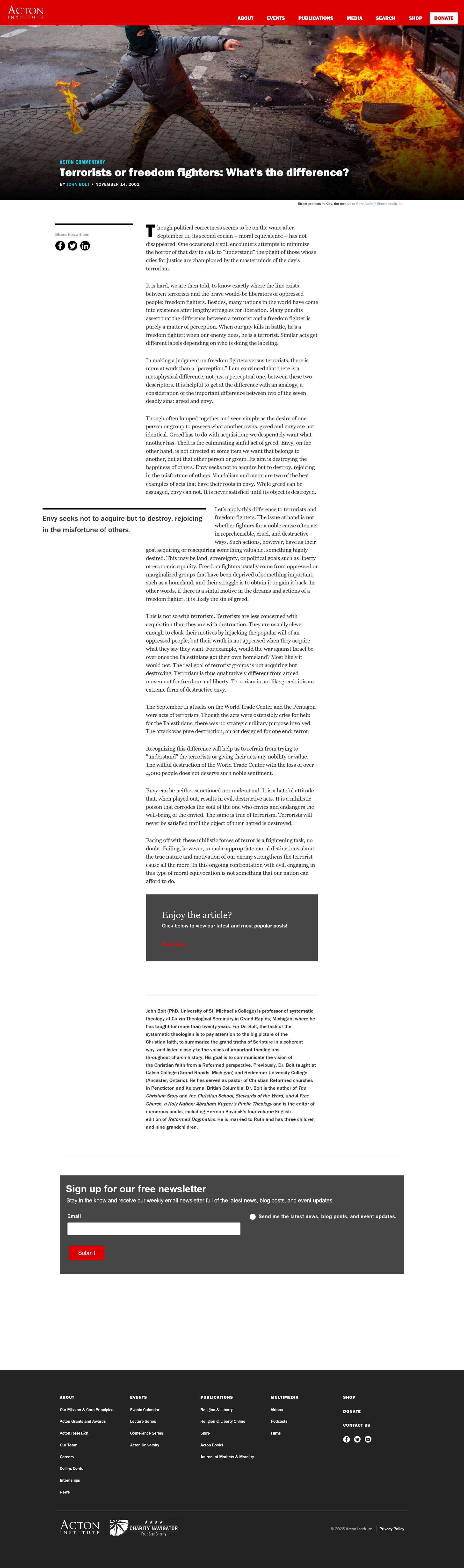 Terrorism is a premeditated act of violence and intimidation directed against civilians and intended to achieve clear political aims.* The definition of terrorism is a subjective matter. The difference between a terrorist and a freedom fighter is a matter of perspective, it all depends on the observer and the verdict of history. Professor John Bolt described it by saying:When our guy kills in battle, he’s a freedom fighter; when our enemy does, he is a terrorist. Similar acts get different labels depending on who is doing the labeling.** See also Good vs Evil.