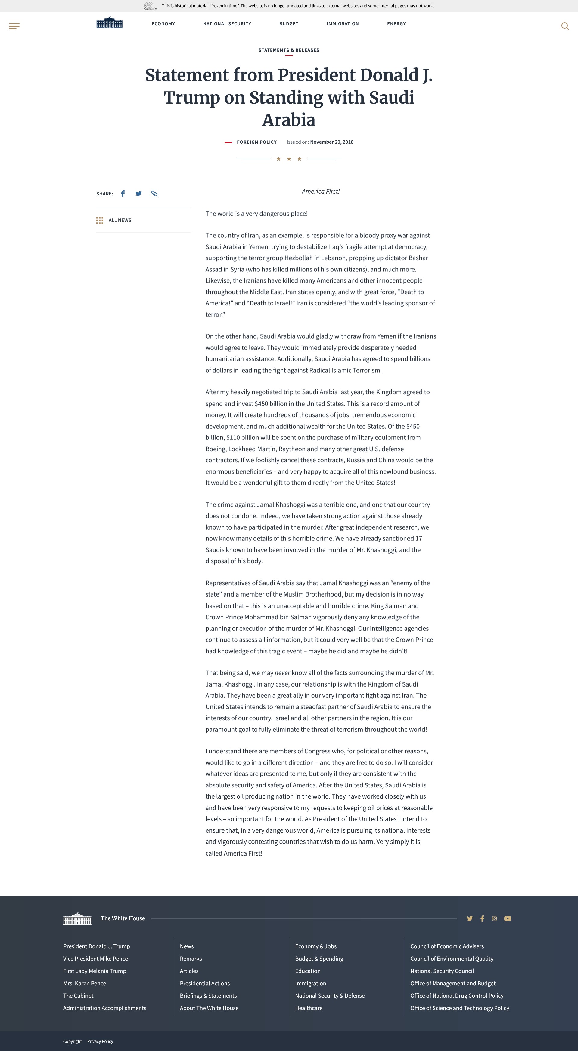 Donald Trump called Iranthe world’s leading sponsor of terror** while in the photo he proudly shows a chart highlighting arms sales to Saudi Arabia, one of the world's largest exporters of Islamic terrorism. Concerning the September 11 attacks, 15 of the 19 hijackers were citizens of Saudi Arabia, but that obviously doesn't mean anything to the president of the USA. At a commemoration of these attacks in 2017 he said:The terrorists who attacked us thought they could incite fear and weaken the spirit. Those who try will soon join the long list of vanquished enemies who dare to test our mettle.** Everybody knows that Iraq and Afghanistan had nothing to do with the 9/11 Attacks, but the US invaded these as part of their lucrative war on terror. Meanwhile America is complicit in war crimes in Yemen*...