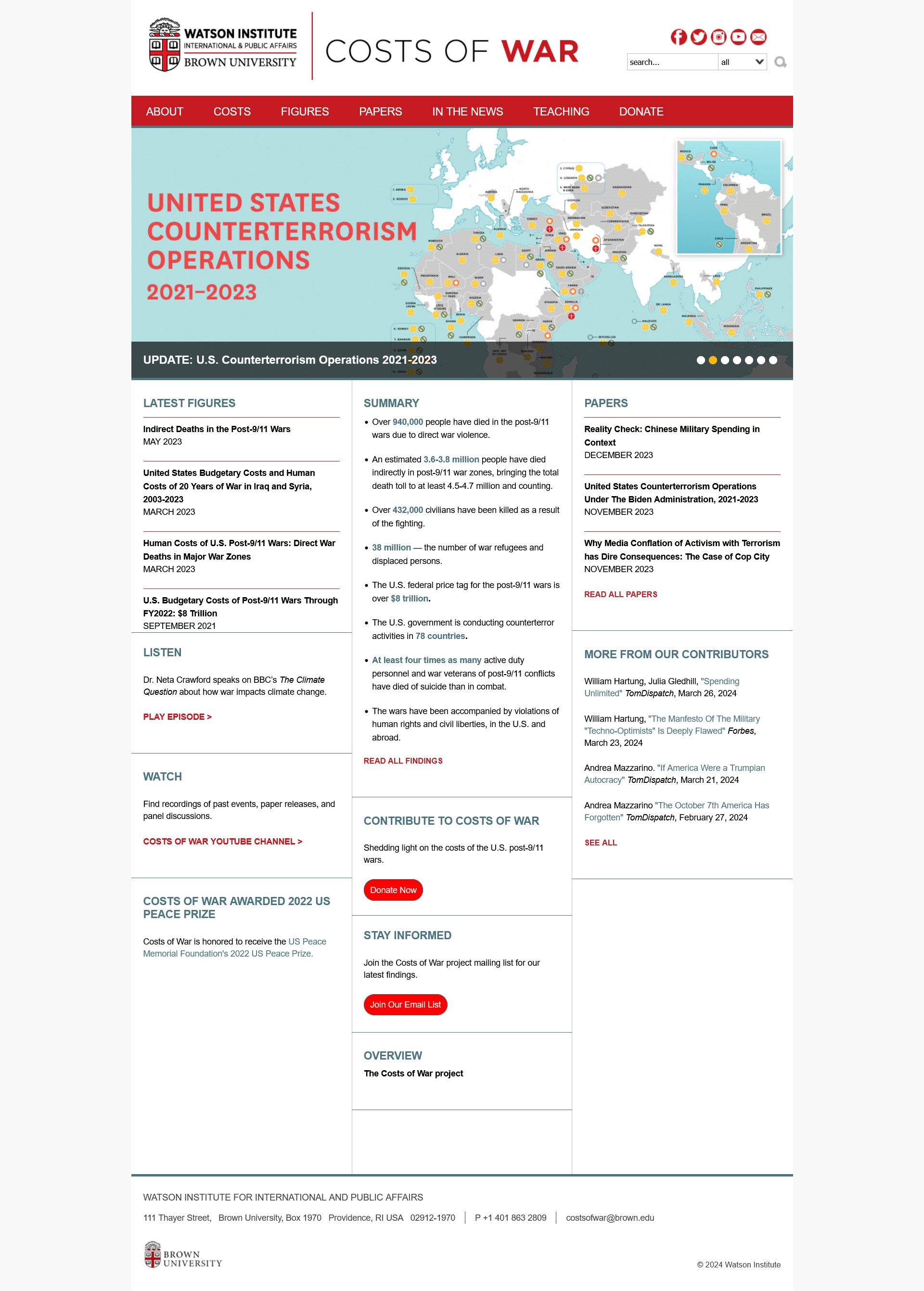 Over 940,000 people have died in the post-9/11 wars due to direct war violence. An estimated 3.6-3.8 million people have died indirectly in post-9/11 war zones, bringing the total death toll to at least 4.5-4.7 million and counting. Over 432,000 civilians have been killed as a result of the fighting. 38 million — the number of war refugees and displaced persons.*