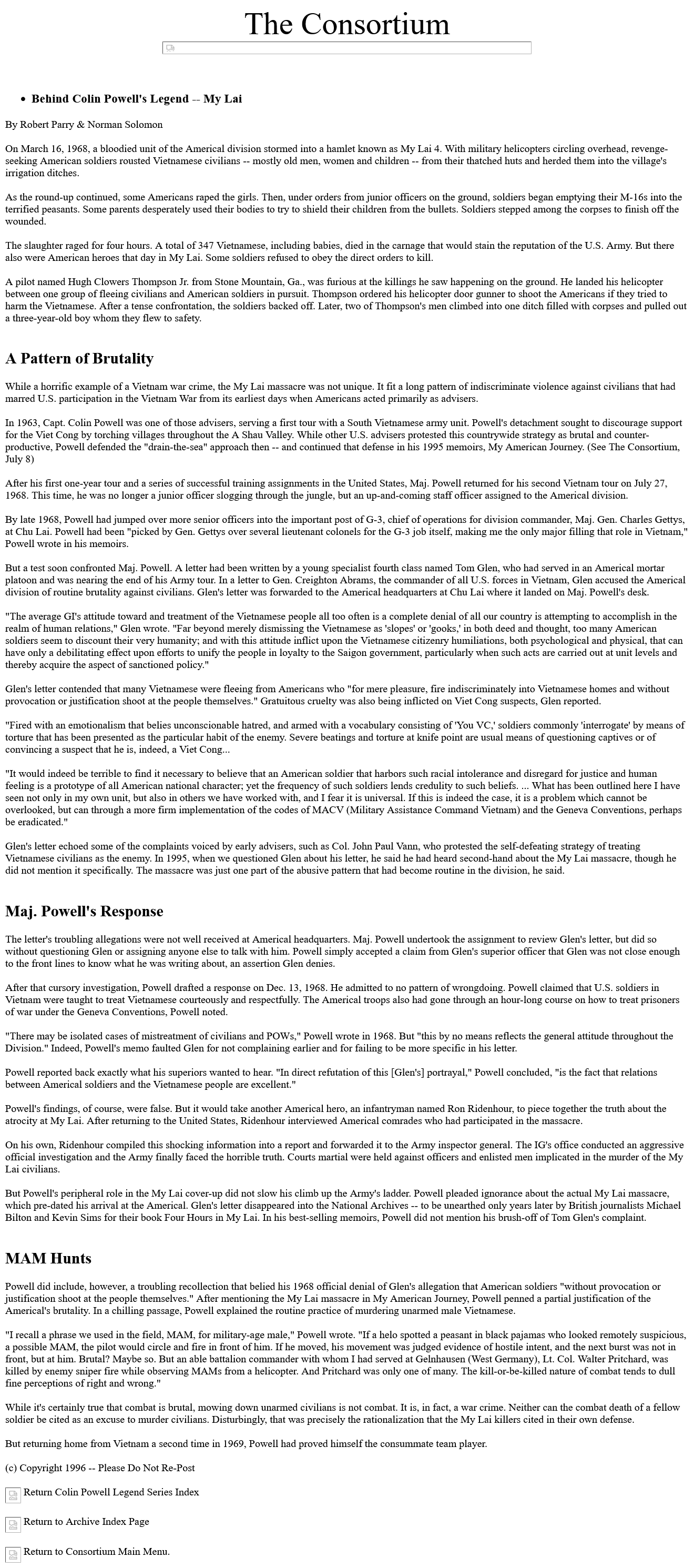 Involved in the cover-up was Colin Powell who at that time was army major and charged with investigating a letter describing ongoing and routine brutality against Vietnamese civilians on the part of American forces. Powell's handling of the assignment was later characterized by some observers as "whitewashing" the atrocities.* Colin Powell later became United States Secretary of State under George W. Bush and was responsible for the false evidence presented at the United Nations in order to create the support for the Iraq War, another aggressive war.