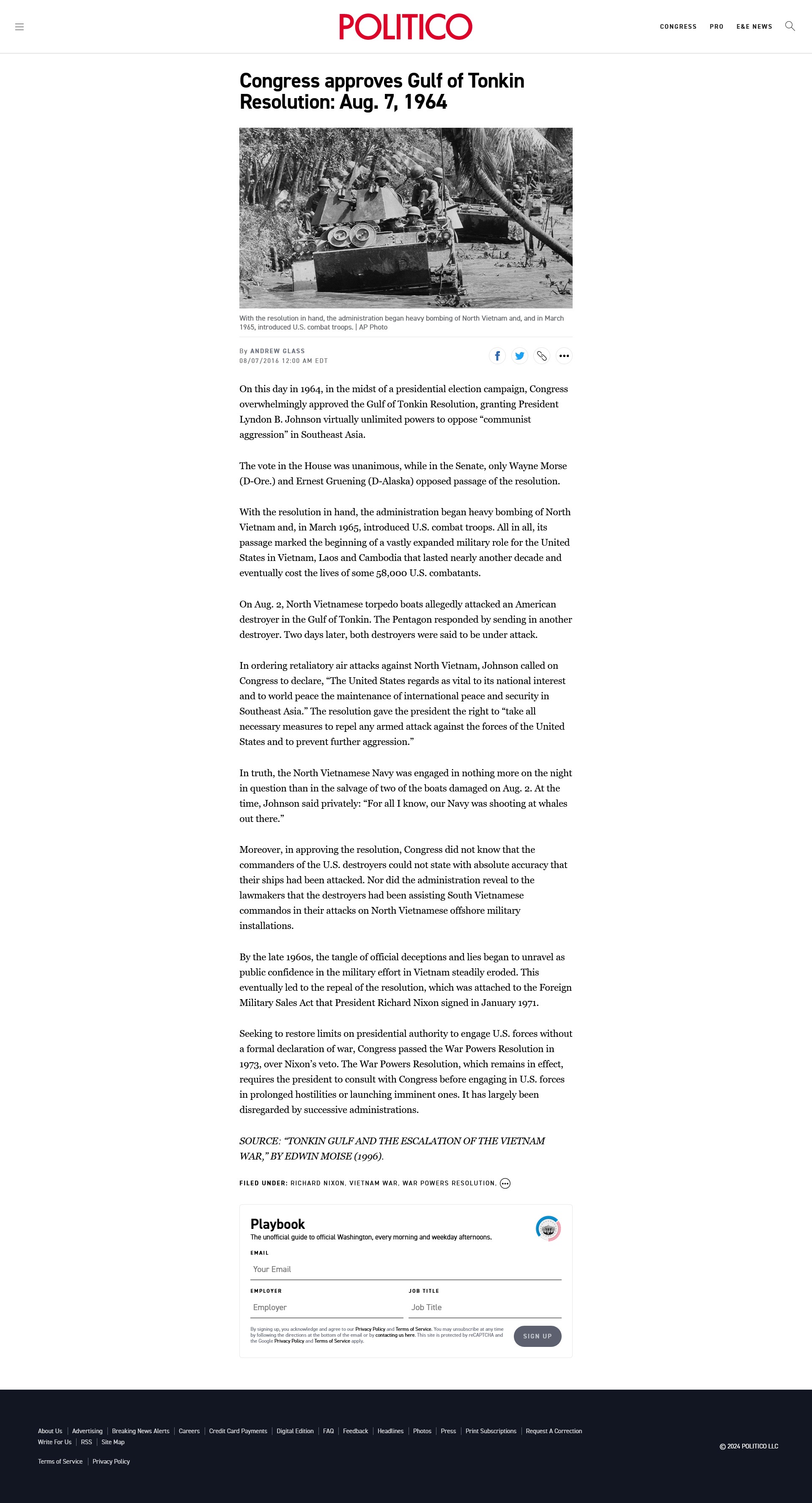 The Gulf of Tonkin Incident, also known as the USS Maddox Incident, is the name given to two separate confrontations involving North Vietnam and the United States in the waters of the Gulf of Tonkin. The outcome of these two incidents was the passage by Congress of the Gulf of Tonkin Resolution, which granted President Lyndon B. Johnson the authority to assist any Southeast Asian country whose government was considered to be jeopardized by "communist aggression". The resolution served as Johnson's legal justification for deploying US conventional forces and the commencement of open warfare against North Vietnam. ... It was originally claimed by the National Security Agency that the second Tonkin Gulf incident occurred on August 4, 1964, as another sea battle, but instead may have involved "Tonkin ghosts" (false radar images) and not actual NVN torpedo boat attacks.