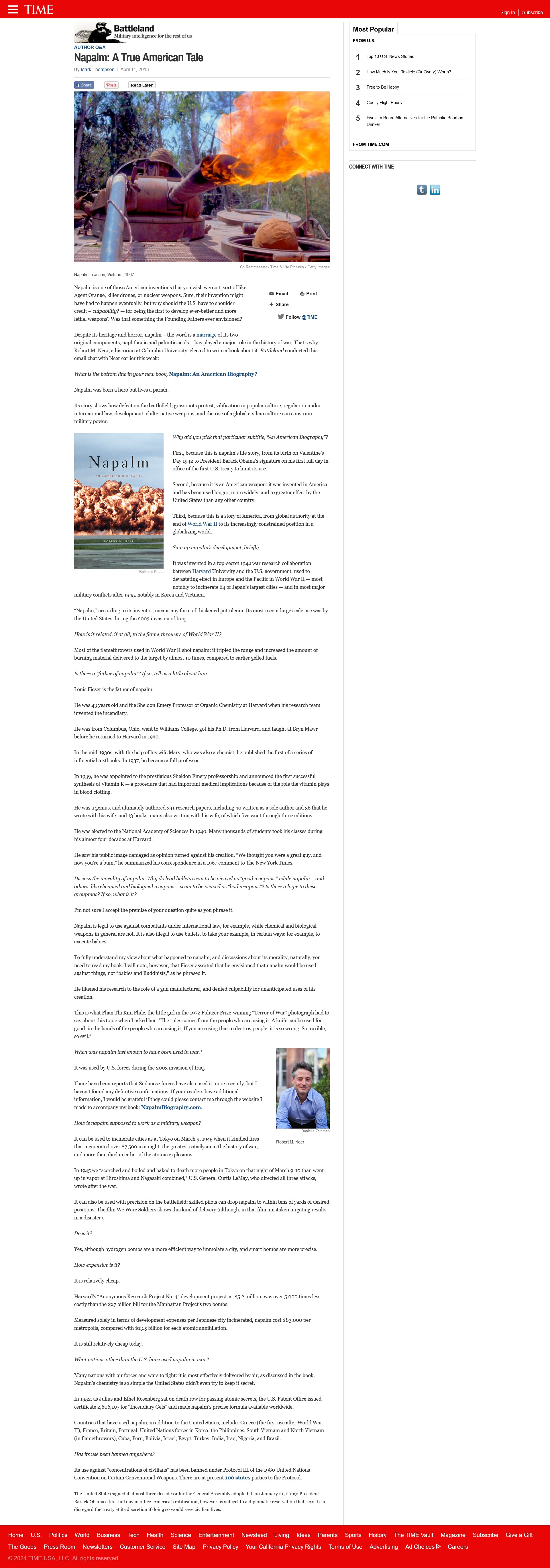 Napalm ... is an American weapon: it was invented in America and has been used longer, more widely, and to greater effect by the United States than any other country. ... this is a story of America, from global authority at the end of World War II to its increasingly constrained position in a globalizing world.*