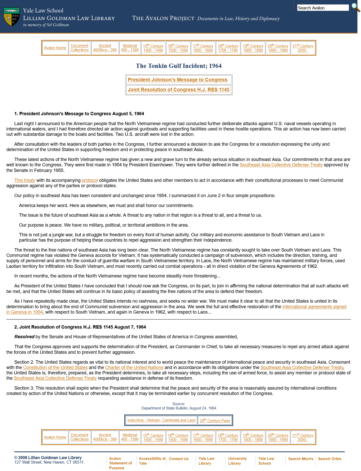 Lyndon B. Johnson was the perverted president who once ordered the White House shower to be directed at his private part.* On 7 August 1964 this pervert said about the Gulf of Tunkin incident:For all I know, our Navy was shooting at whales out there.** He admitted that the second Gulf of Tonkin incident never took place, but it got their war started. See also D. D. Guttenplan's article When presidents lie to make a war **.