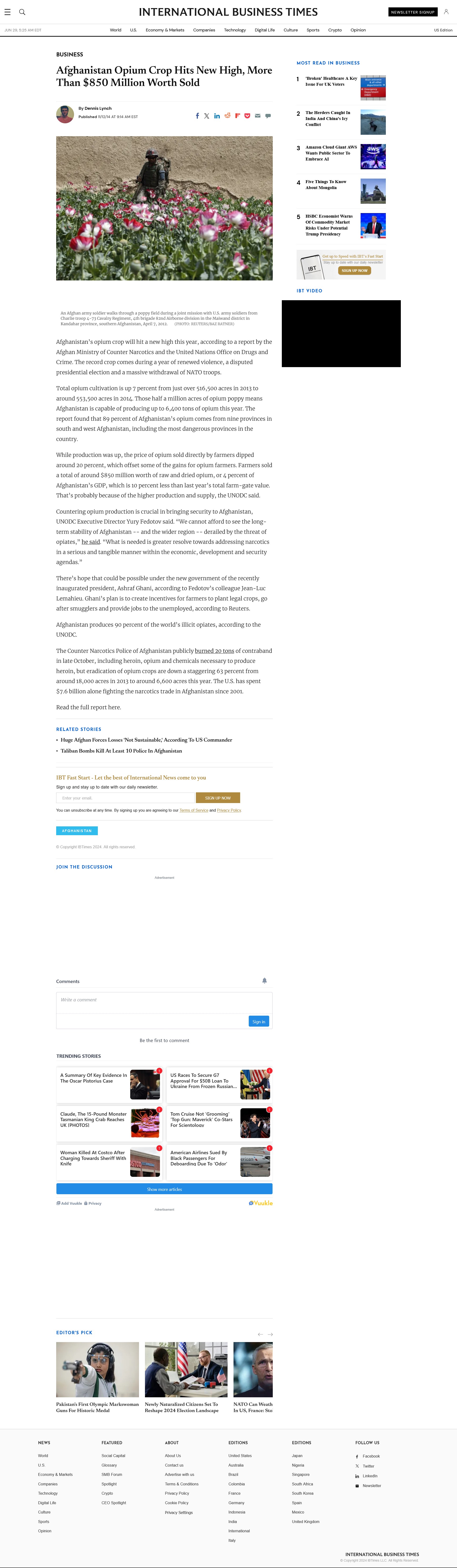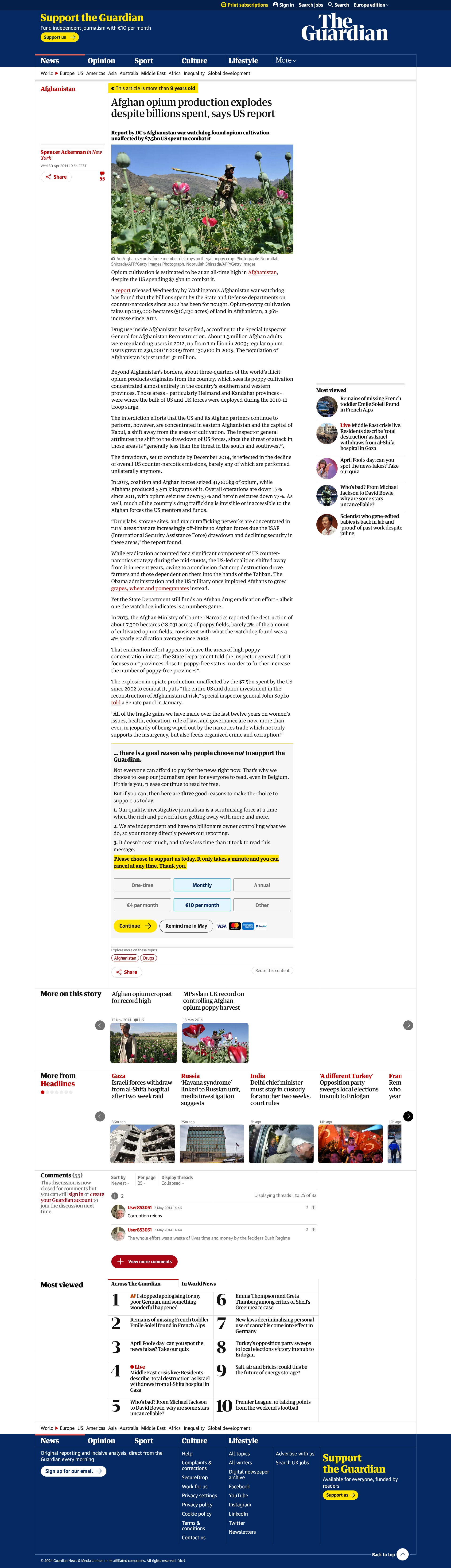 In 2014 The Guardian reported that opium cultivation is estimated to be at an all-time high in Afghanistan, despite the US spending $7.5bn to combat it. ... Opium-poppy cultivation takes up 209,000 hectares (516,230 acres) of land in Afghanistan, a 36% increase since 2012.* The information comes from the UNODC Afghanistan Opium Survey 2017 report which stated that the area under opium poppy cultivation increased by 63% since 2016, reaching a new record high. It reveals the significant increase of opium production in Afghanistan since the United States and NATO forces intervened and occupied the country.