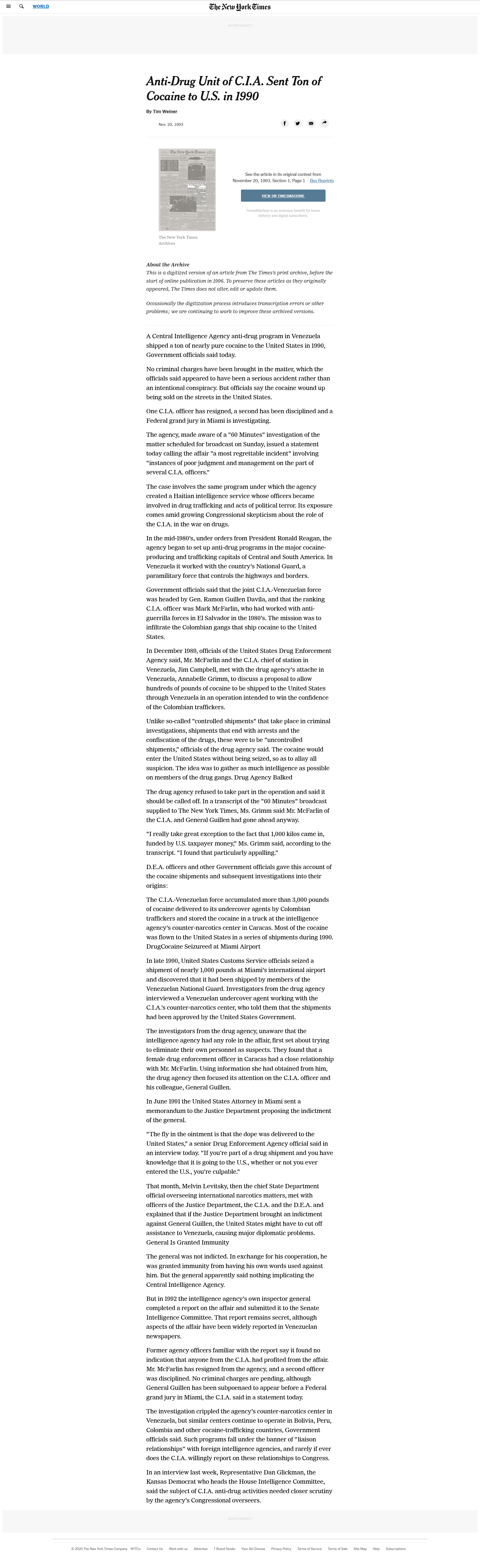 A Central Intelligence Agency anti-drug program in Venezuela shipped a ton of nearly pure cocaine to the United States in 1990, Government officials said today. No criminal charges have been brought in the matter, which the officials said appeared to have been a serious accident rather than an intentional conspiracy. But officials say the cocaine wound up being sold on the streets in the United States. ... The agency... issued a statement today calling the affair "a most regrettable incident" involving "instances of poor judgment and management on the part of several C.I.A. officers." The case involves the same program under which the agency created a Haitian intelligence service whose officers became involved in drug trafficking and acts of political terror. ... In the mid-1980's, under orders from President Ronald Reagan, the agency began to set up anti-drug programs in the major cocaine-producing and trafficking capitals of Central and South America. In Venezuela it worked with the country's National Guard, a paramilitary force that controls the highways and borders.*