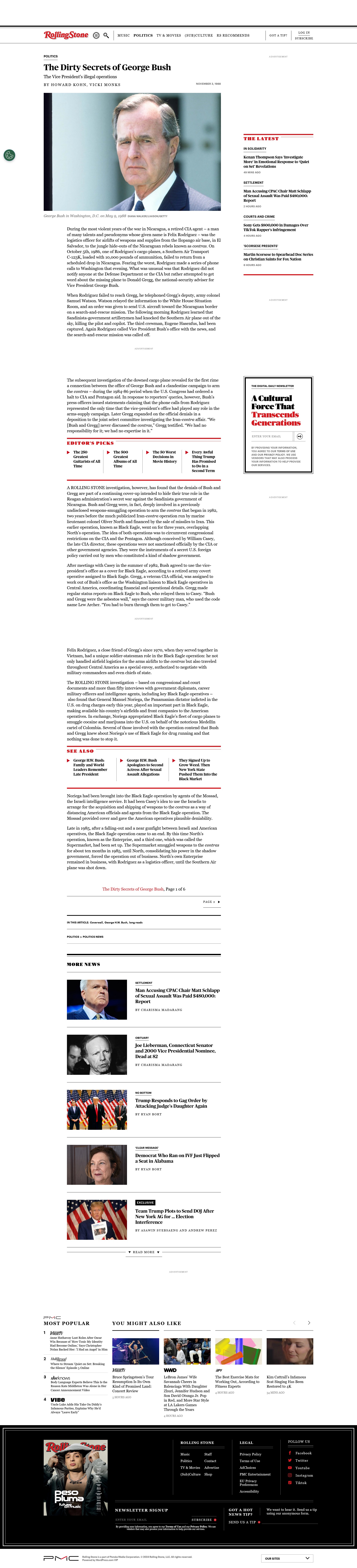 Bush and Gregg were, in fact, deeply involved in a previously undisclosed weapons-smuggling operation to arm the contras that began in 1982, two years before the much publicized Iran-contra operation run by marine lieutenant colonel Oliver North and financed by the sale of missiles to Iran. This earlier operation, known as Black Eagle, went on for three years, overlapping North’s operation. The idea of both operations was to circumvent congressional restrictions on the CIA and the Pentagon. Although conceived by William Casey, the late CIA director, these operations were not sanctioned officially by the CIA or other government agencies. They were the instruments of a secret U.S. foreign policy carried out by men who constituted a kind of shadow government.*