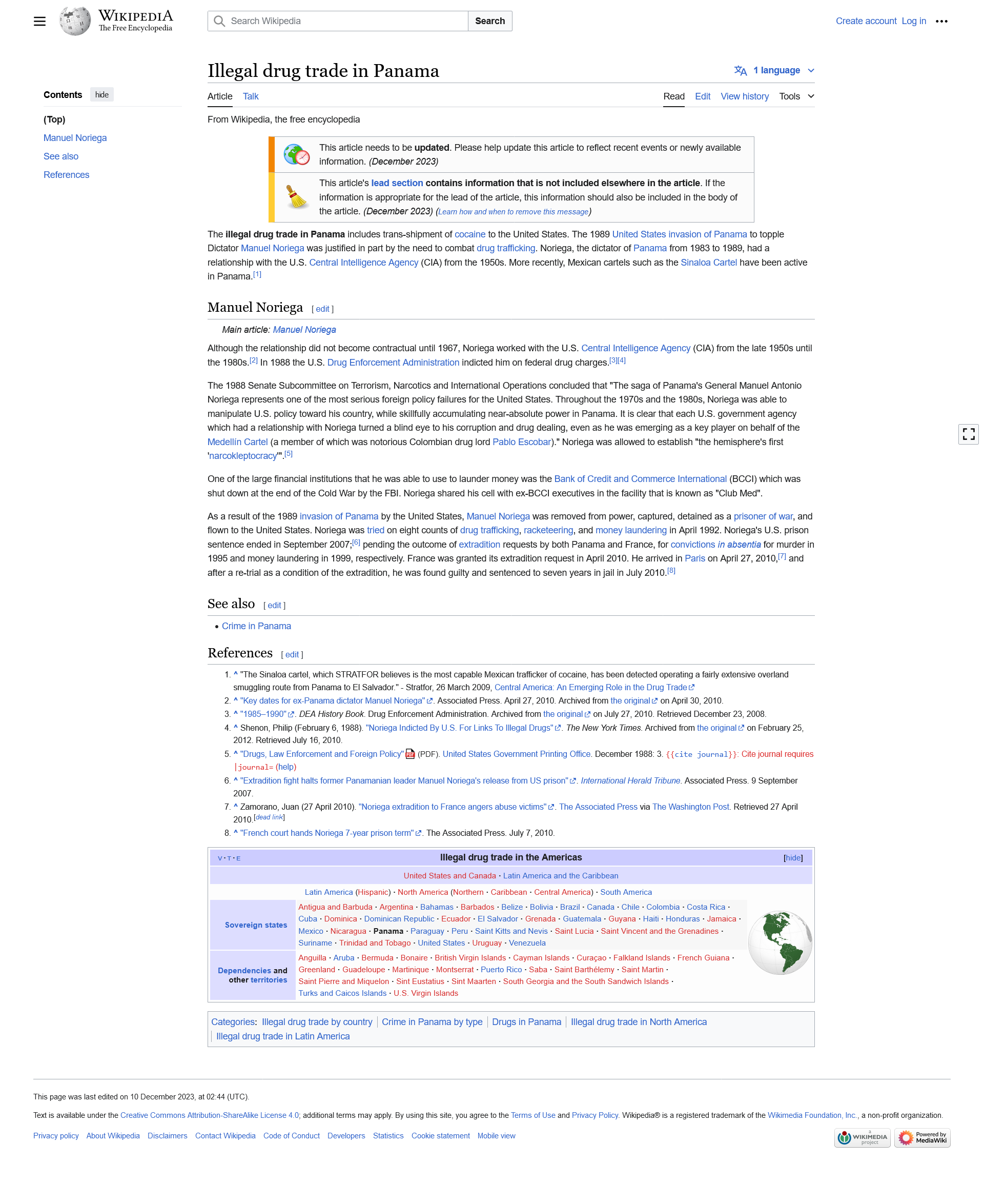 Throughout the 1970s and the 1980s, Noriega was able to manipulate U.S. policy toward his country, while skillfully accumulating near-absolute power in Panama. It is clear that each U.S. government agency which had a relationship with Noriega turned a blind eye to his corruption and drug dealing, even as he was emerging as a key player on behalf of the Medellín Cartel (notorious for Colombian drug lord Pablo Escobar). Noriega was allowed to establish "the hemisphere's first narcokleptocracy". ... One of the large financial institutions that he was able to use to launder money was the Bank of Credit and Commerce International (BCCI) which was shut down at the end of the Cold War by the FBI.*