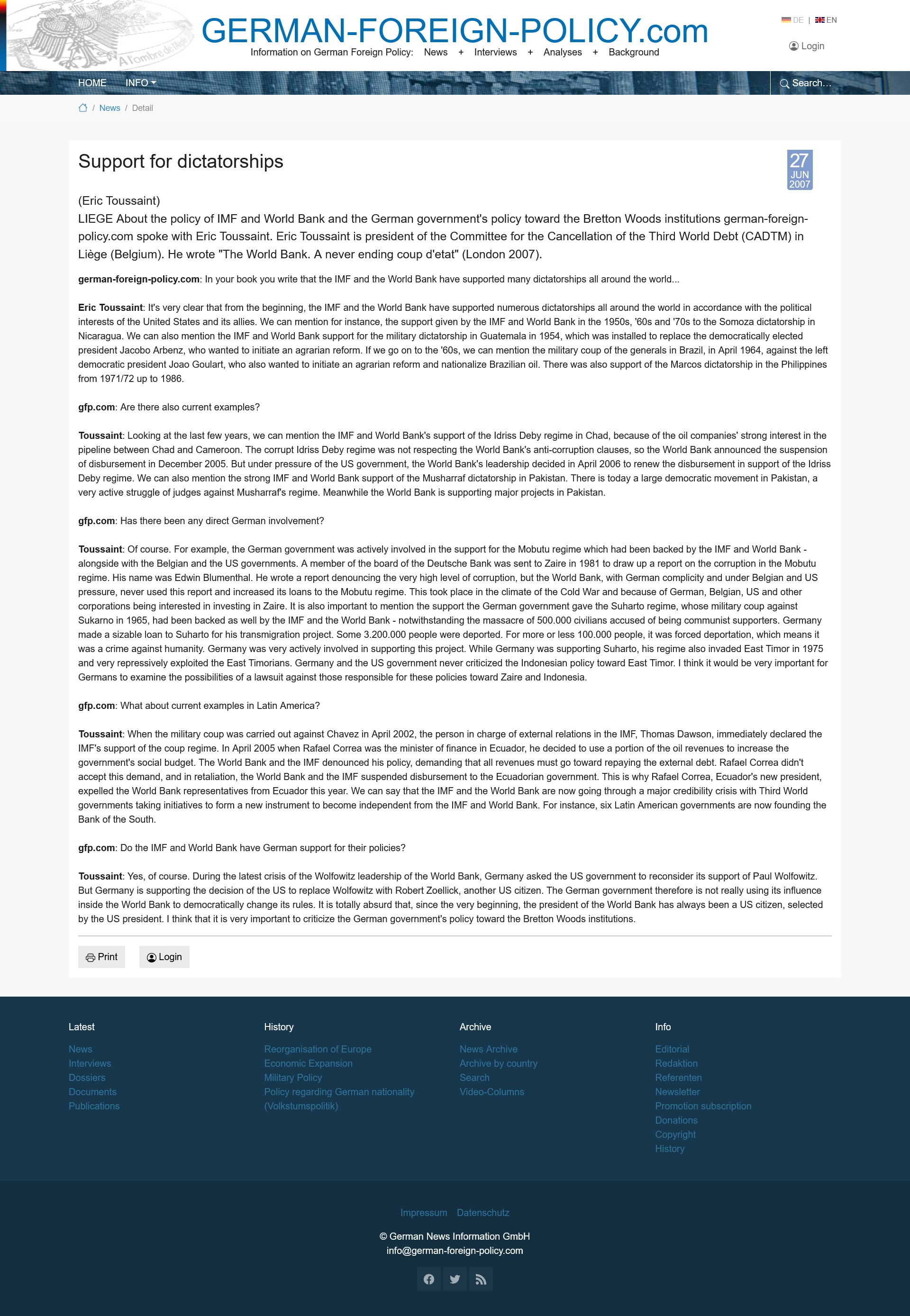 It's very clear that from the beginning, the IMF and the World Bank have supported numerous dictatorships all around the world in accordance with the political interests of the United States and its allies.*