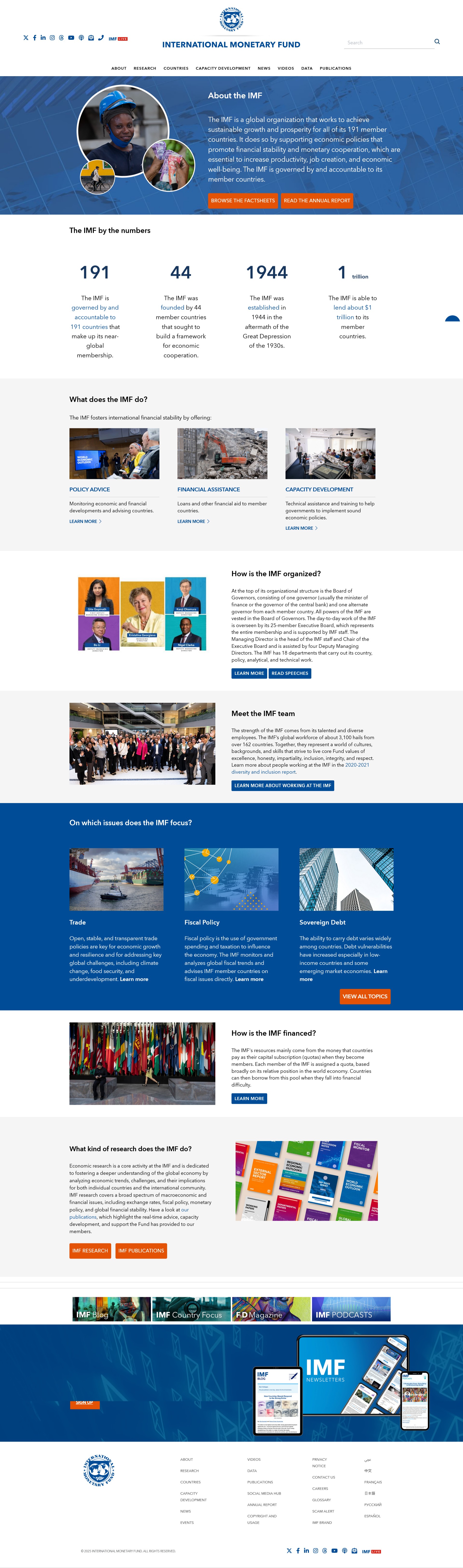 The IMF is a global organization that works to achieve sustainable growth and prosperity for all of its 191 member countries. It does so by supporting economic policies that promote financial stability and monetary cooperation, which are essential to increase productivity, job creation, and economic well-being. The IMF is governed by and accountable to its member countries.*