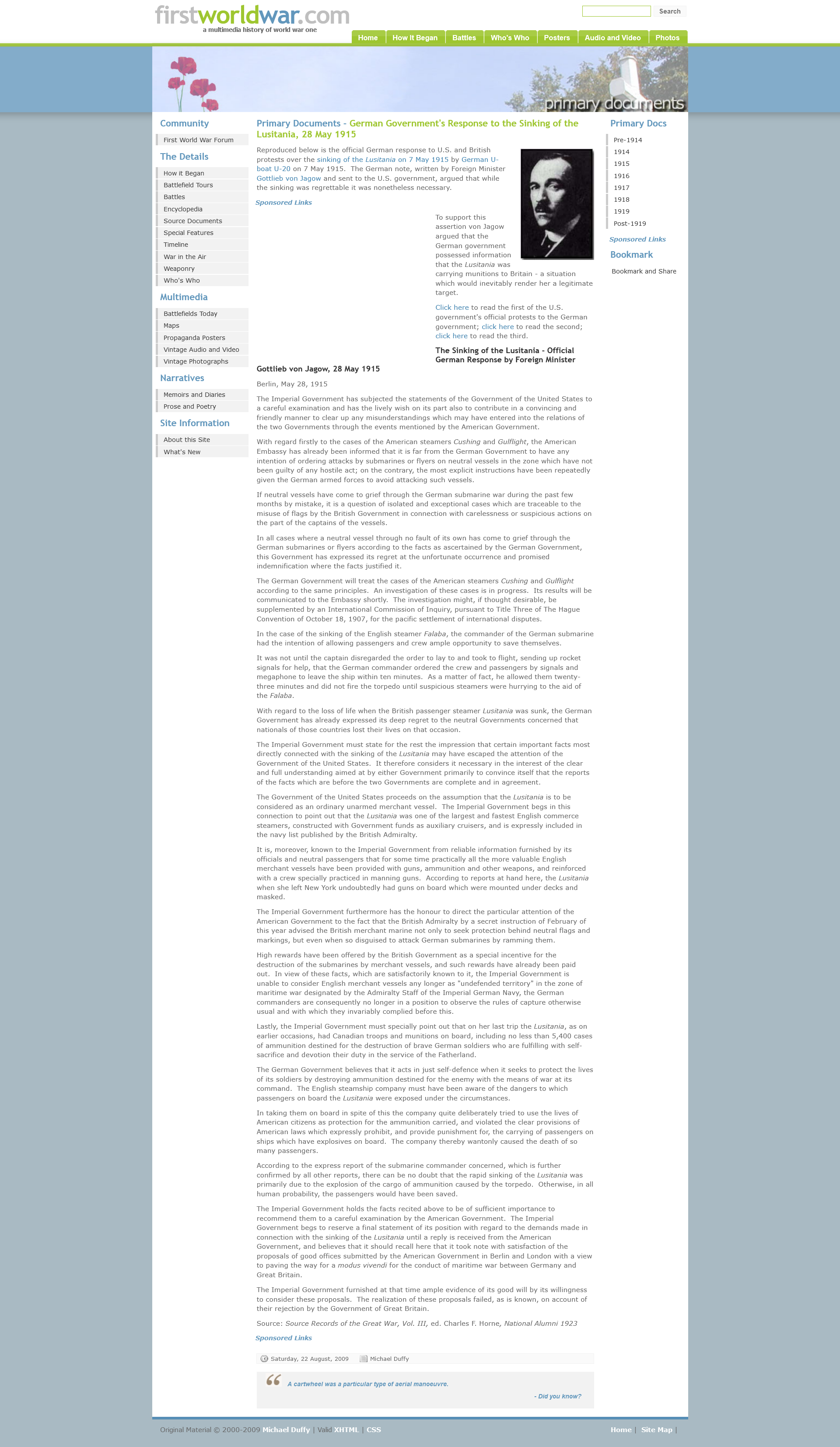 A German U-boat torpedoed the RMS Lusitania, killing 1,198 and leaving 761 survivors. On 28 May 1915 German diplomat Gottlieb von Jagow argued that the German government possessed information that the Lusitania was carrying munitions to Britain - a situation which would inevitably render her a legitimate target.* As expected and to the benefit of the Anglo-American elite the sinking turned public opinion in many countries against Germany, it contributed to the American entry into World War I and became an iconic symbol in military recruiting campaigns of why the war was being fought.