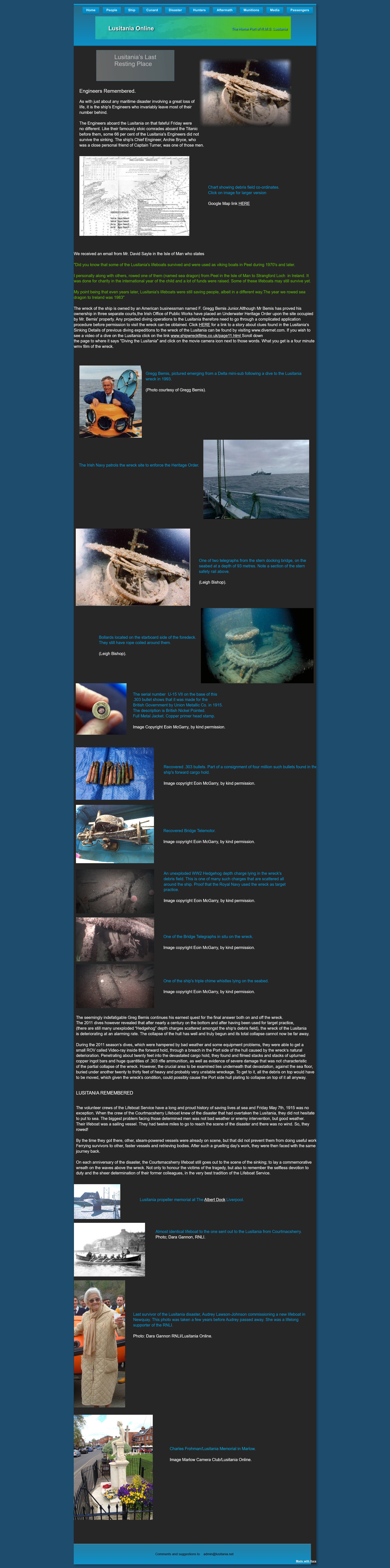 Successive British governments have always maintained that there was no munitions on board the Lusitania (and that the Germans were therefore in the wrong to claim to the contrary as an excuse for sinking the ship), ... The facts are that there is a large amount of ammunition in the wreck, some of which is highly dangerous. The Treasury have decided that they must inform the salvage company of this fact in the interests of the safety of all concerned. Although there have been rumours in the press that the previous denial of the presence of munitions was untrue, this would be the first acknowledgement of the facts by HMG.*
