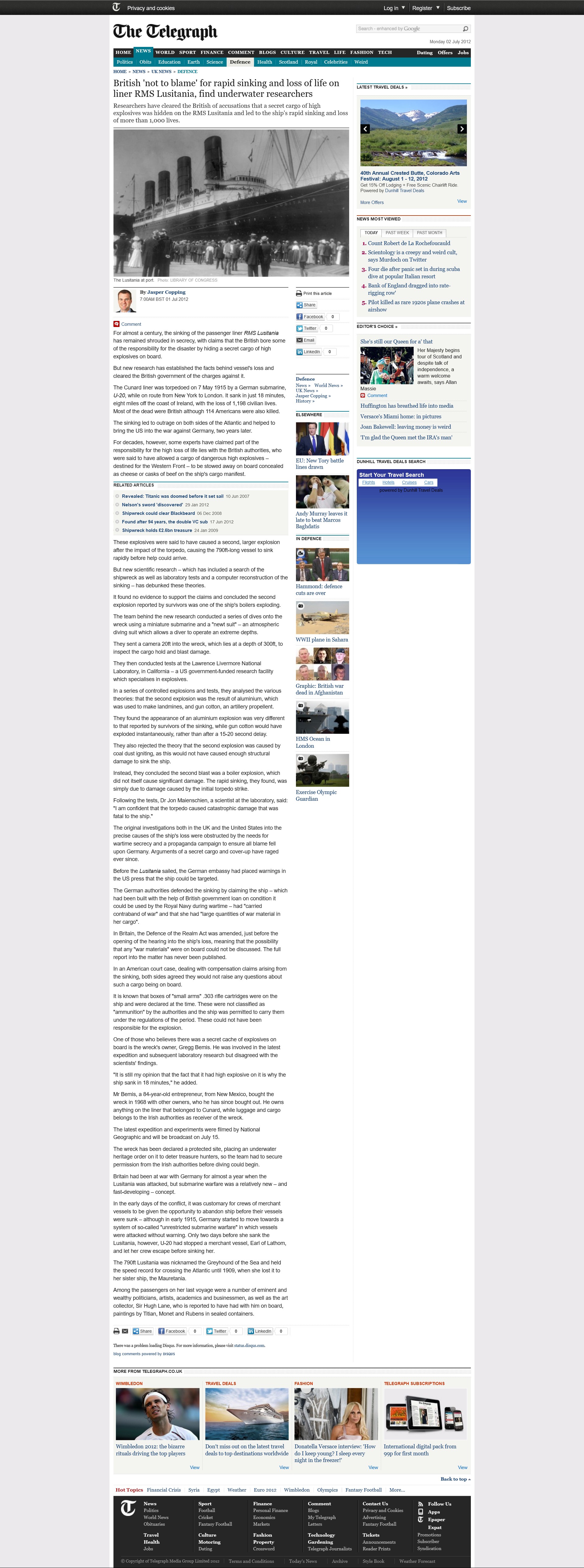 Jasper Copping - British 'not to blame' for rapid sinking and loss of life on liner RMS Lusitania, find underwater researchers