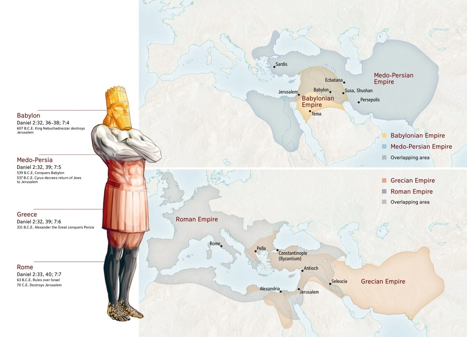 You, O sovereign, were looking on, and saw a great image! This great image, and its brightness excellent, was standing before you, and its form was awesome. This image’s head was of fine gold, its chest and arms of silver, its belly and thighs of bronze, its legs of iron, its feet partly of iron and partly of clay.