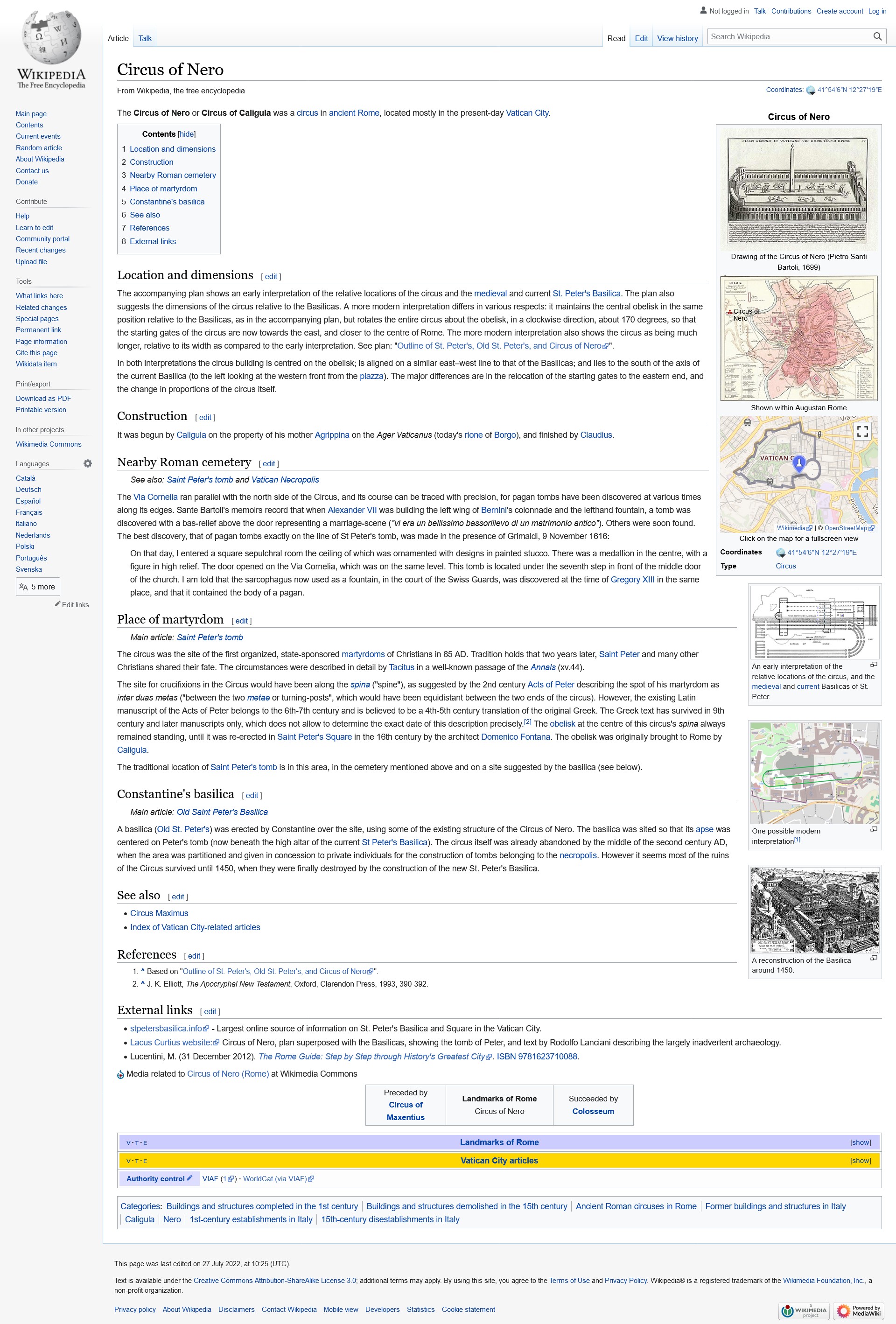 The Circus of Nero ... was a circus in ancient Rome, located mostly in the present-day Vatican City. ... The circus was the site of the first organized, state-sponsored martyrdoms of Christians in 65. ... The obelisk at the centre of this circus's spina always remained standing, until it was re-erected in Saint Peter's Square...*