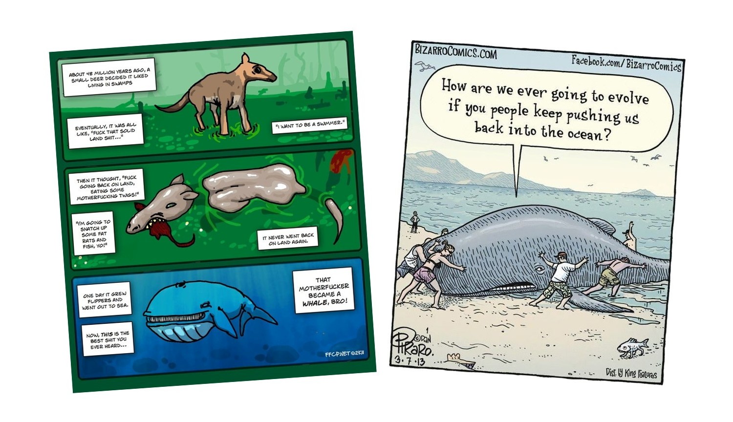 Computer-generated images of Super-Tiktaaliks fly out of the water with a narrator saying things likeprimitive air breathing lungs kick in, simple wristbones propel them off the ground, this amazing creature is the first vertebrate to walk on land* with bombastic music in the background.