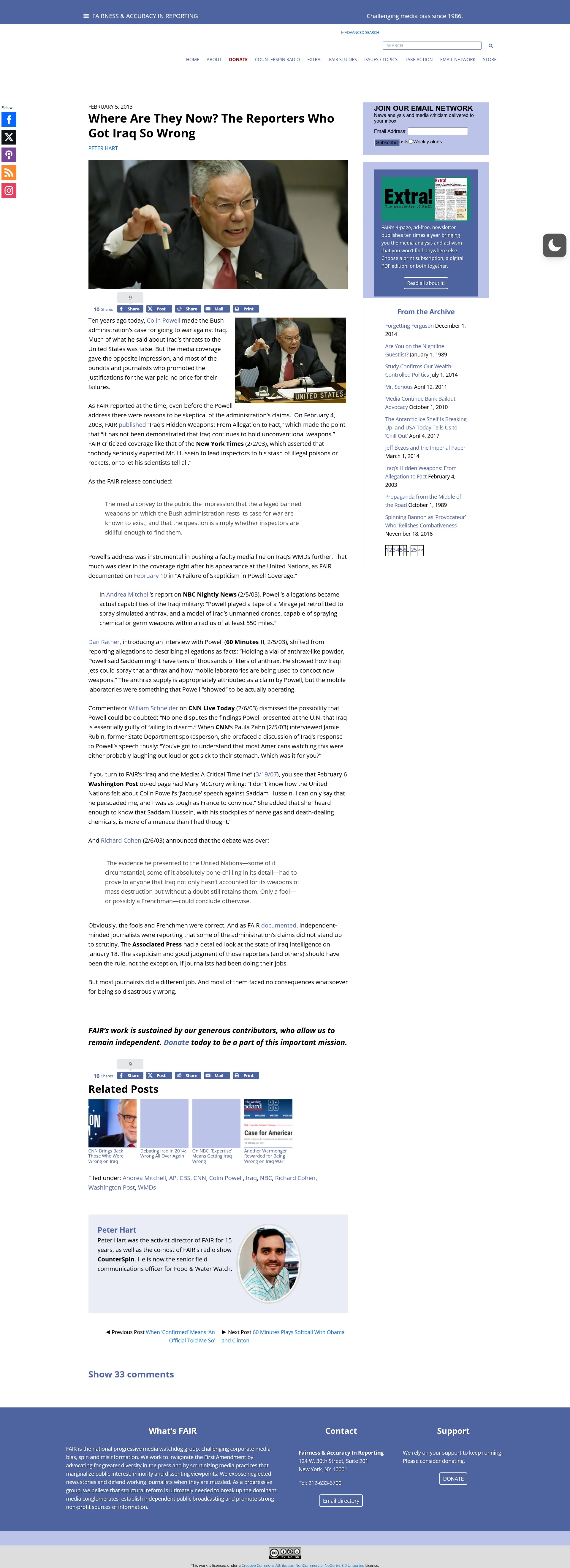 President Bush and seven top officials made 935 false statements leading up to the Iraq war.* That's a lot of lies for getting the support for an unjust war. And of course the mass media, owned and controlled by the power elite, played along with the scheme. One reporter wrote about Powell's statements:Much of what he said about Iraq's threats to the United States was false. But the media coverage gave the opposite impression, and most of the pundits and journalists who promoted the justifications for the war paid no price for their failures.** Another reporter said:The war on Iraq won't be remembered for how it was waged so much as for how it was sold. It was a propaganda war, a war of perception management.**