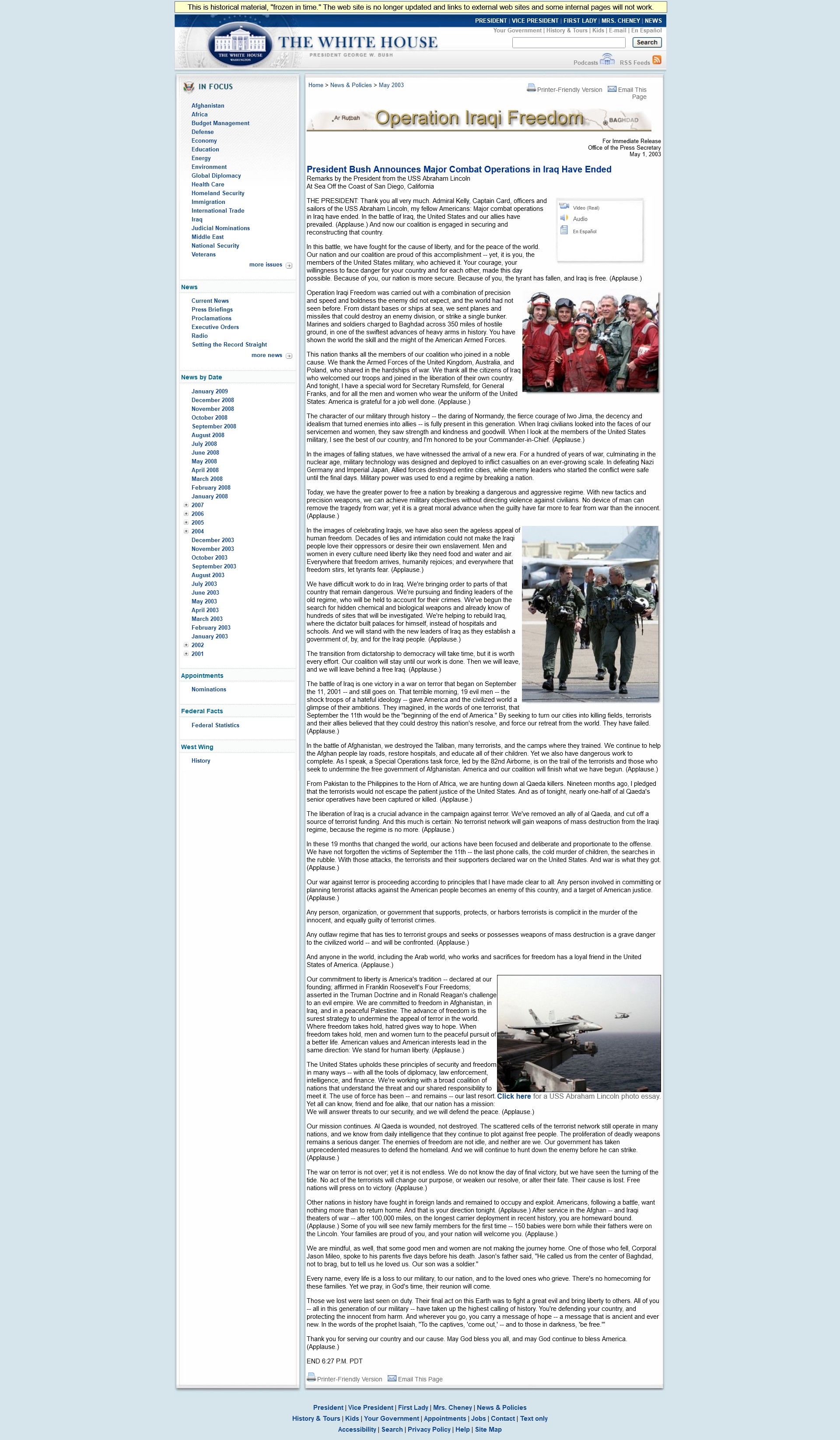 In the morning of 1 May 2003 president George W. Bush bowed his head in prayer, and said:Today we recognize the many ways our country has been blessed, and we acknowledge the source of those blessings. Millions of Americans seek guidance every day in prayer to the Almighty God. I am one of them.** In the evening of that same day he speeched from the USS Abraham Lincoln off the Coast of San Diego, California:In the battle of Iraq, the United States and our allies have prevailed. And now our coalition is engaged in securing and reconstructing that country.**