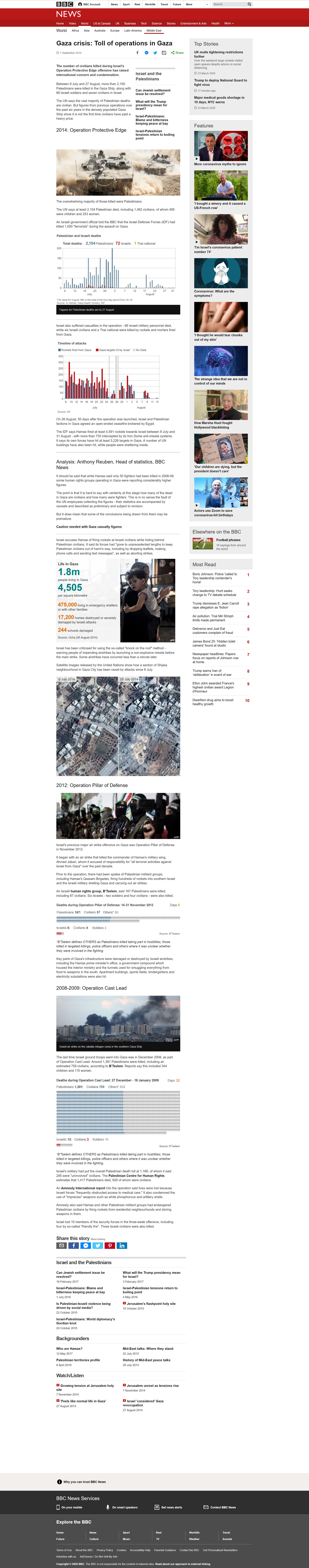 From the end of September 2000 through the end of September 2017, Palestinians killed 813 Israeli civilians.* In 2014 between 8 July and 27 August, more than 2,100 Palestinians were killed in the Gaza Strip... The UN says the vast majority of Palestinian deaths are civilian.* In 17 years Palestinians killed 813 Israeli civilians. In less than two months in 2014 Israelis killed more than 2,100 Palestinians. In 2009 Human Rights Watch said that Israel's repeated firing of white phosphorus shells over densely populated areas of Gaza during its recent military campaign was indiscriminate and is evidence of war crimes.* In July 2014 Israeli PM Benjamin Netanyahu said...