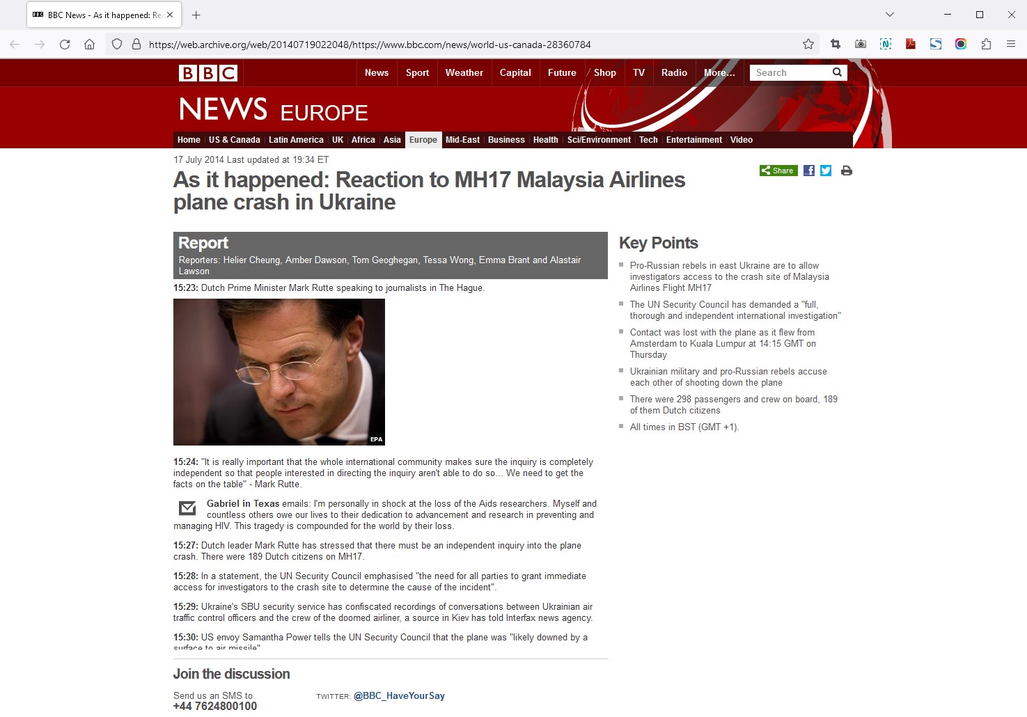 The YouTube channel on which this video appears was created on 7 April 2014, at the time of the Ukrainian Crisis, and has a link to the official SBU homepage. The western media eagerly took this video as evidence without question. Forbes headlined: Smoking Guns: Russian Separatists Shot Down Malaysian Flight MH17; Putin Must Be Held Responsible ** and Business Insider: This Video Shows The Evidence Ukraine Has Put Together About The Downing Of Malaysia Flight MH17 **. However, audio analysts easily showed that the video was a fabrication of the SBU.* It consists of three separate conversations*, as also mentioned by RT*, the Russian news outlet which was later banned by these so-called democratic western governments.