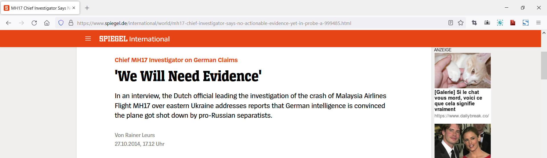 If at all there was any evidence against Russia it would have been presented to the world immediately with a big show. But there was no evidence of Russia's involvement. The disaster happened on 17 July. But even after publication of the preliminary report provided by the Dutch Safety Board in September 2014 there was still no conclusive evidence whatsoever. Not even in October as the chief investigator for the Dutch national prosecution service confirmed. That also means that the Ukrainian government and western media lied and presented a pre-fabricated story...