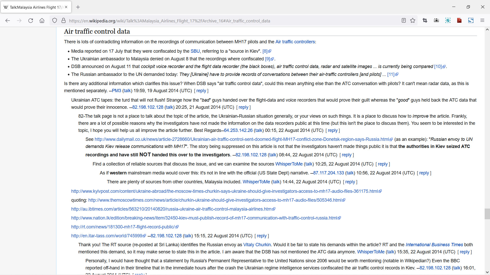 But Ukraine did not release its air traffic control data. On the day of the disaster the BBC published an article with the following information:Ukraine's SBU security service has confiscated recordings of conversations between Ukrainian air traffic control officers and the crew of the doomed airliner, a source in Kiev has told Interfax news agency.** Supposedly the recordings were confiscated by the corrupt Ukraine's Security Service directly after the disaster. This was also noted in a later Wikipedia Talk called Talk:Malaysia Airlines Flight 17/Archive 16 *...