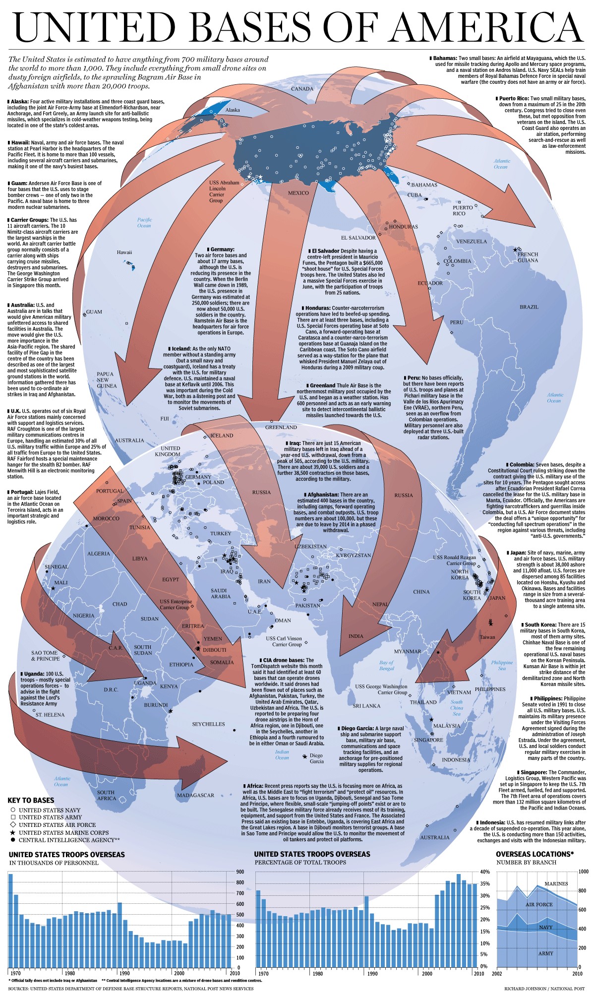 The Anglo-American Empire is by far the most militarized empire ever. In 2015 the military of the United States was deployed in 147 countries around the world while there are in total 195 countries in the world. Especially since World War II the United States has intentionally expanded its military bases around the world. Military expansion serves economic objectives. It's all part of American imperialism. See also NATO Imperialism and New Cold War.