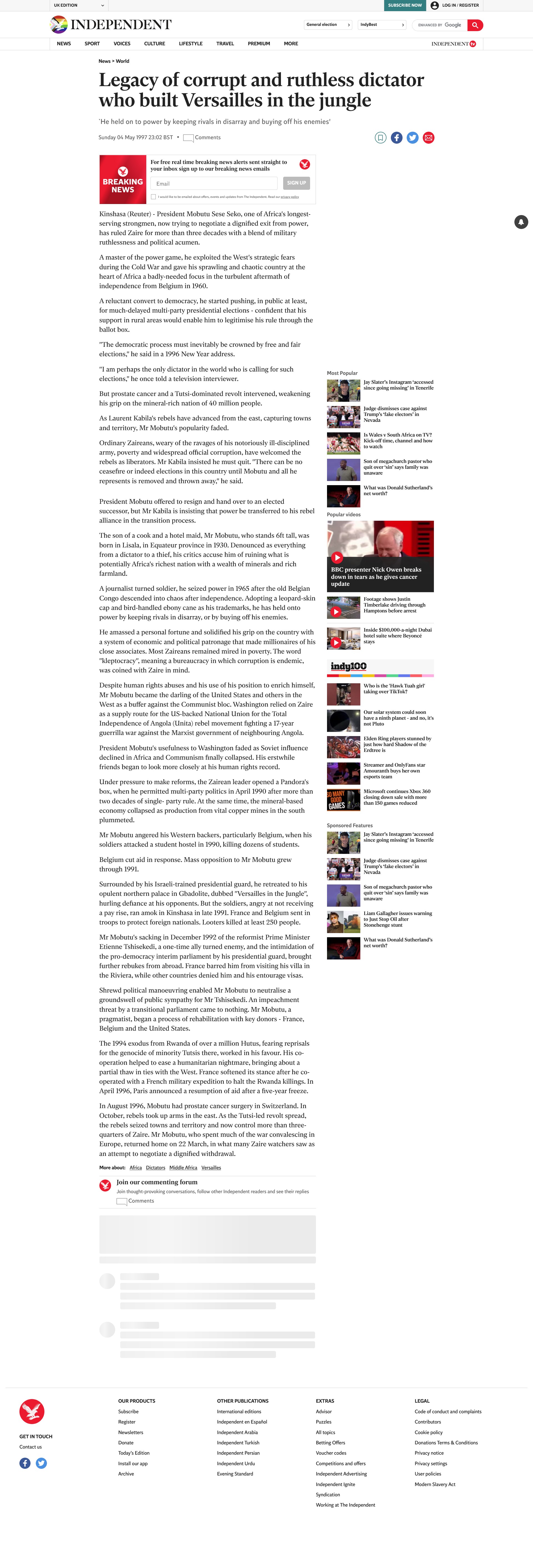 Mobutu Sese Seko was the military dictator and President of the "Democratic Republic" of the Congo from 1965 to 1997. He was an extremely corrupt and ruthless dictator who built Versailles in the jungle.* He was labeled one of the world's top criminals*. The New York Times reported that Mobuto was called one of the world's wealthiest heads of state, a brutal dictator, an inveterate meddler in the affairs of neighbors and a colossal ego.* The United States was in business with Mobutu Sese Seko*...