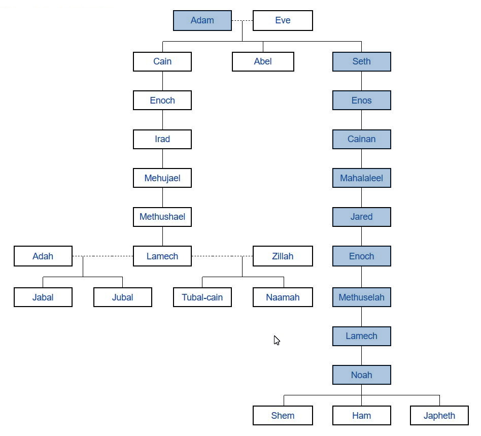 Adam, Seth, Enos, Cainan, Mahalaleel, Jared, Enoch, Methusalah, Lamech, Noah...